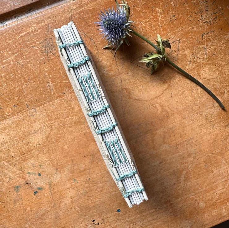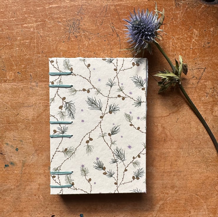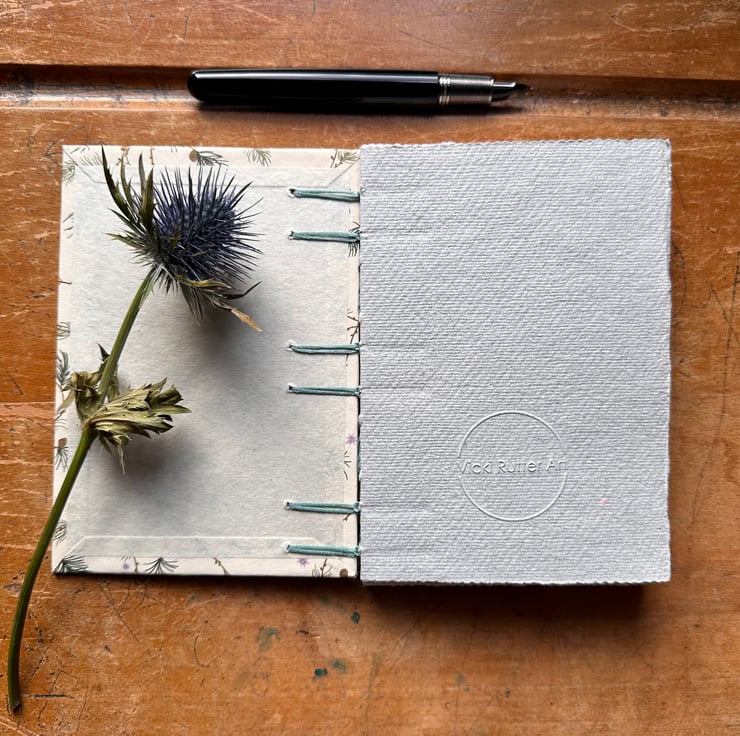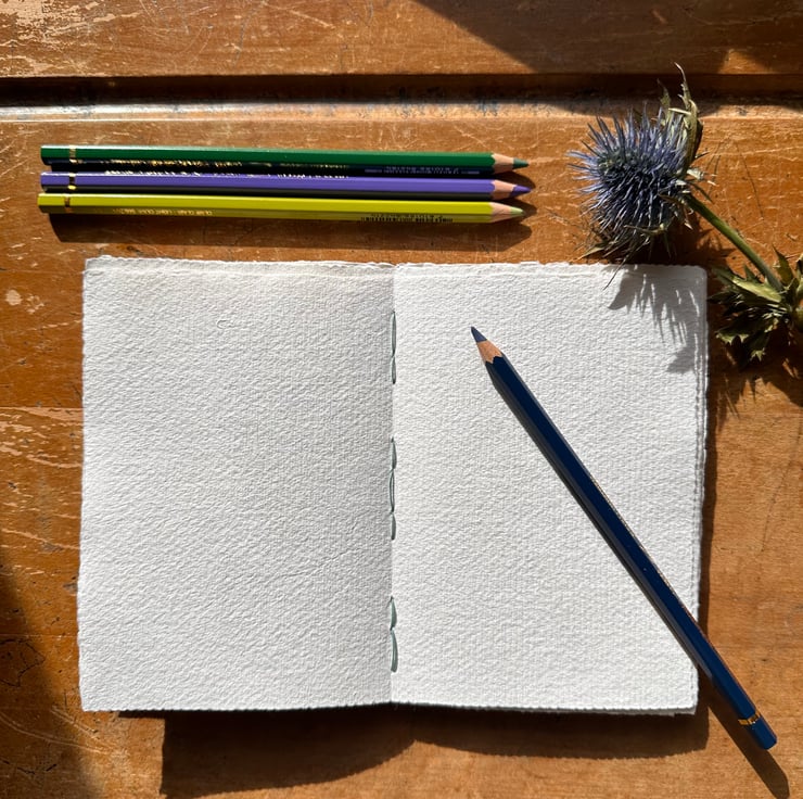 This is a lovely 36 page A6 sketchbook. It has been bound using Coptic stitching which is both beautiful and strong. It allows the pages to lay flat when the book is open, perfect for sketching and writing.