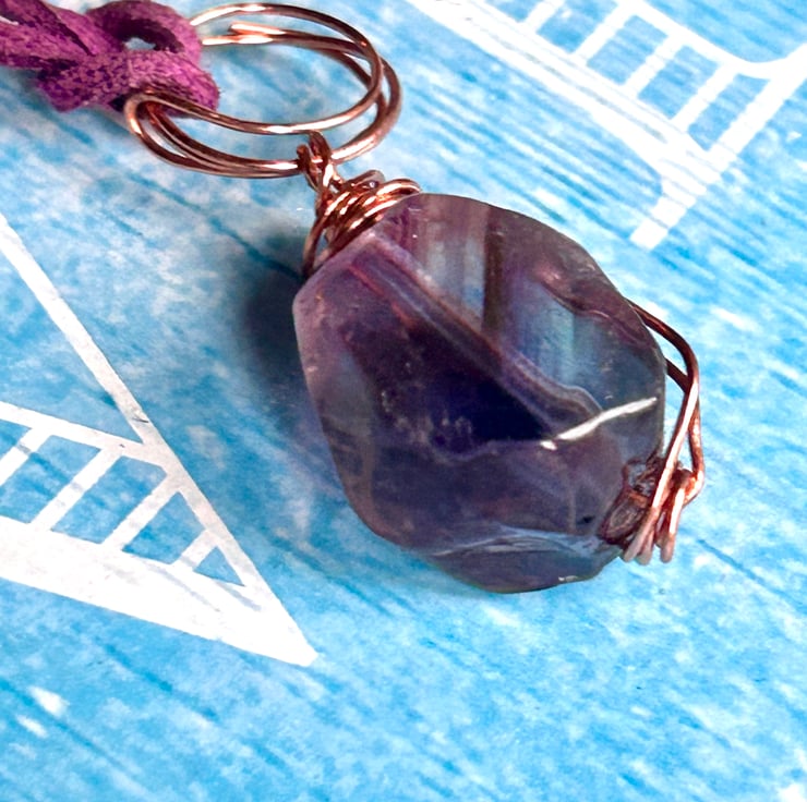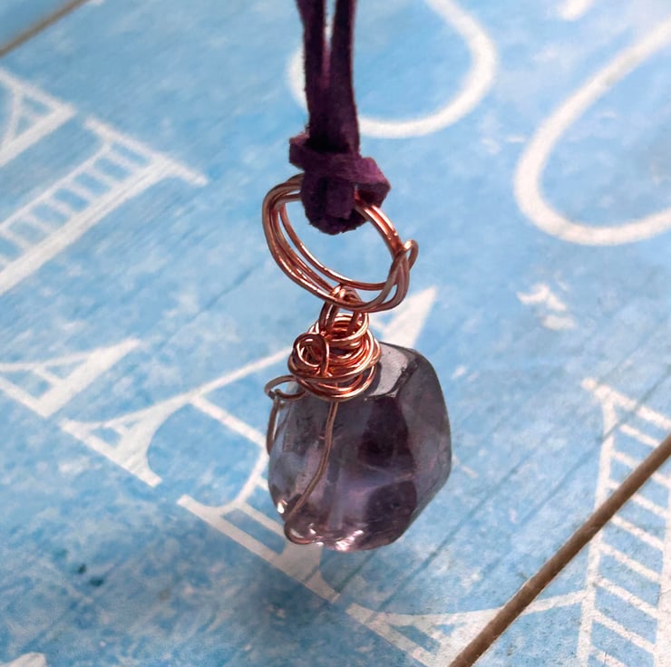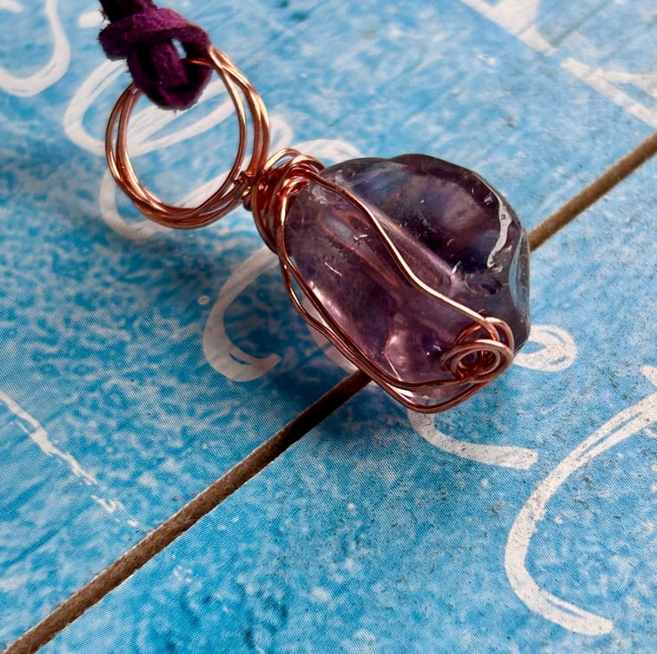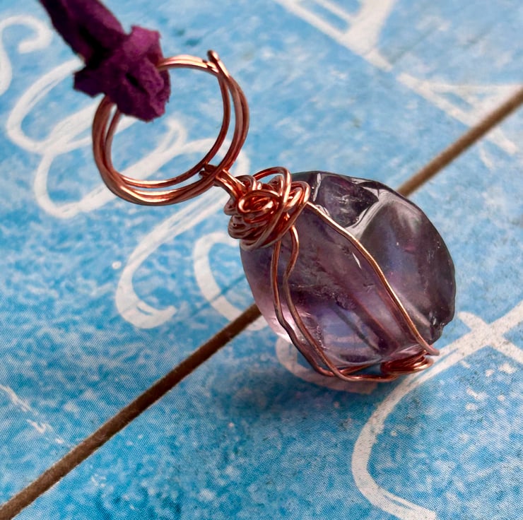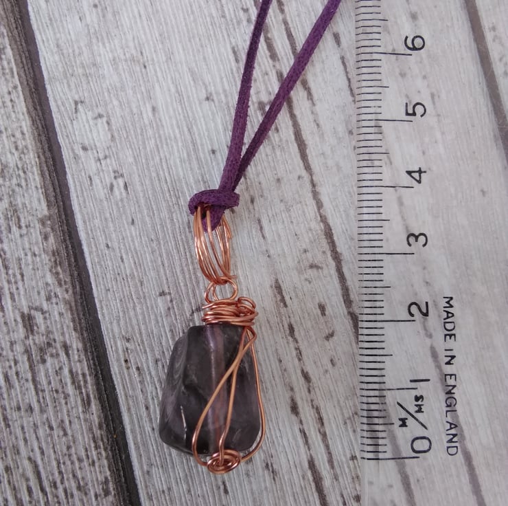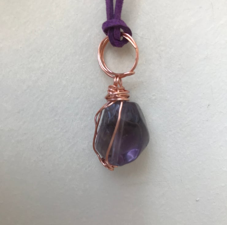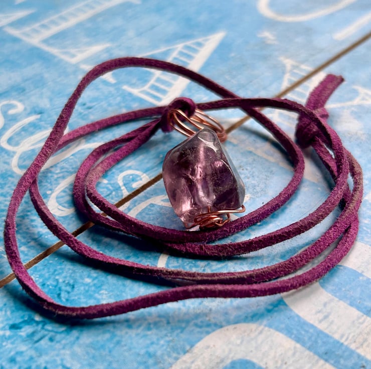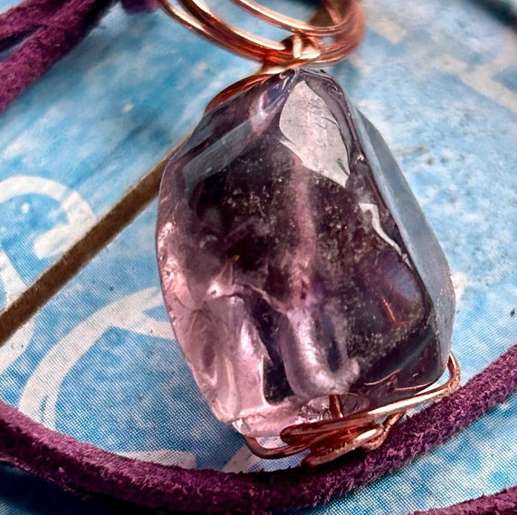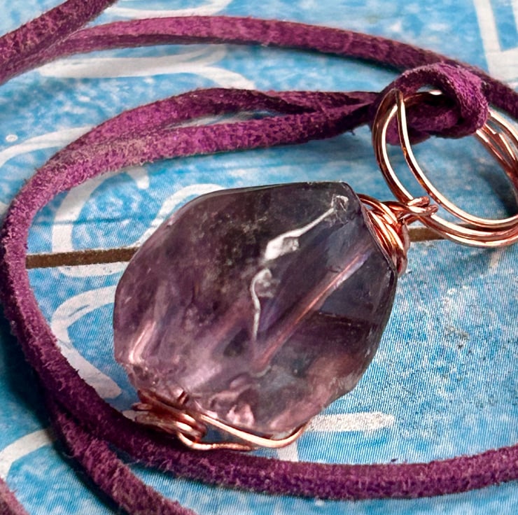 Everyone knows Amethyst, it's one of the most popular quartz stones. This Quartz has been wire wrapped with rose gold plated wire and I have used faux suede in dark purple to match. (Approx 24 inch) A great gift idea or for yourself. It is quite a large stone but not too big to wear with comfort.