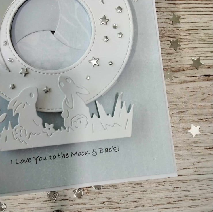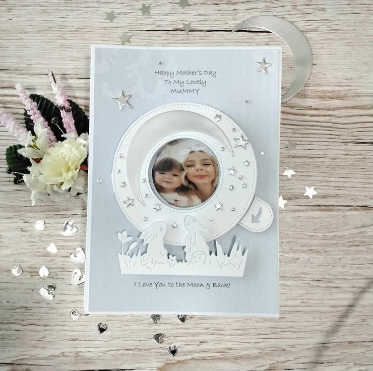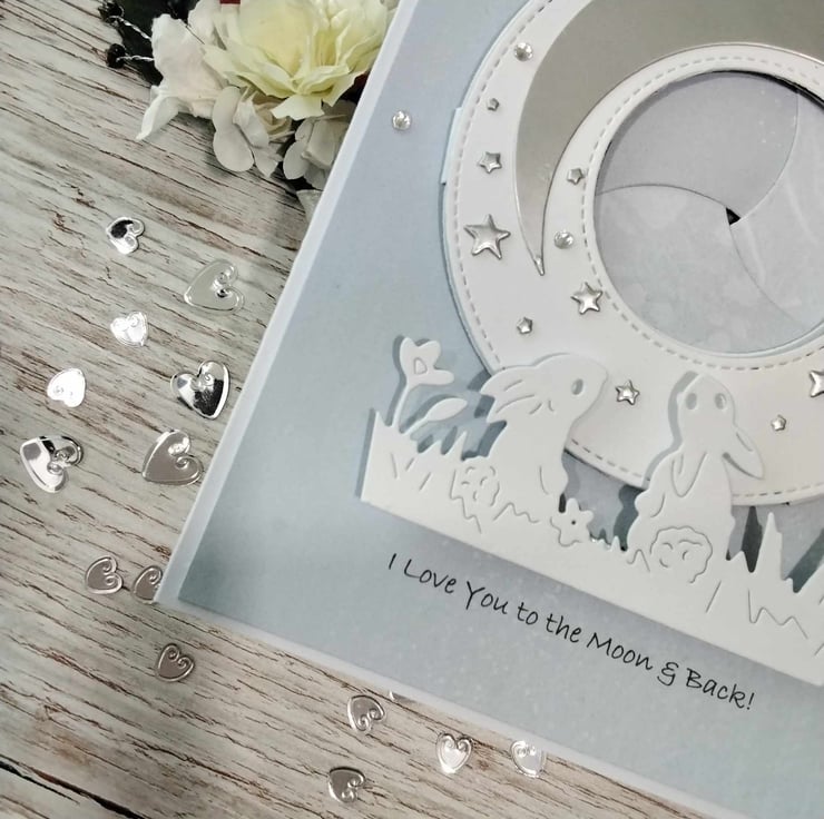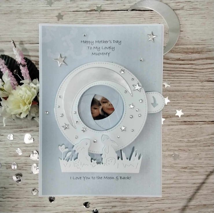 Hand-made, kinetic, personalized card, dimensions are 7"x5" , with presentation box. The theme of this card is Love you to the moon & back, Choose your recipients title, a simple sentiment/verse, add a personal photo, to use on your card, or you can keep the wording on the card as shown. the main feature of this card is the magic iris, which when you gently pull the lever down, opens up to reveal your photo or sentiment, the colour scheme is white, grey, foiled, burnished silver highlights, embellished with, a foiled silver quarter moon and stars, finished with diamante gems. If you would like a different colour scheme, please message me to discus this, also if you wish to add personalization, check spelling/punctuation, many thanks Karen