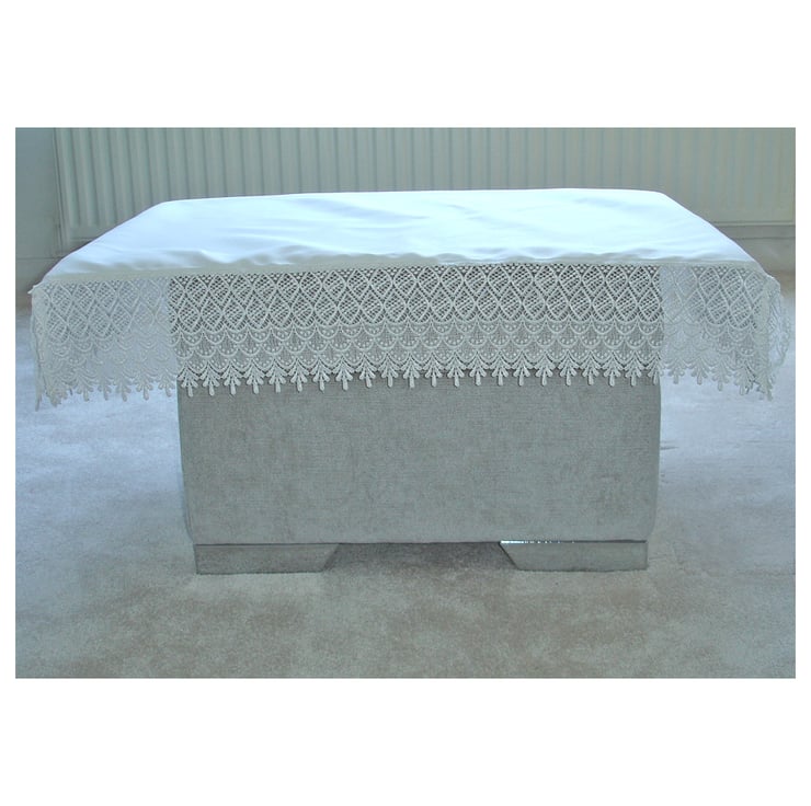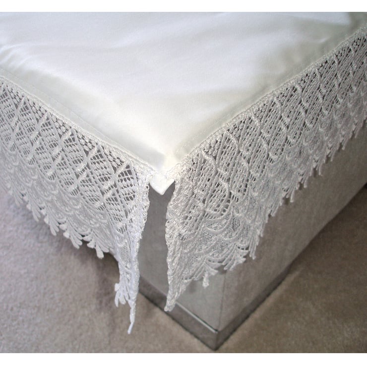 A plain white covering with lace trim.