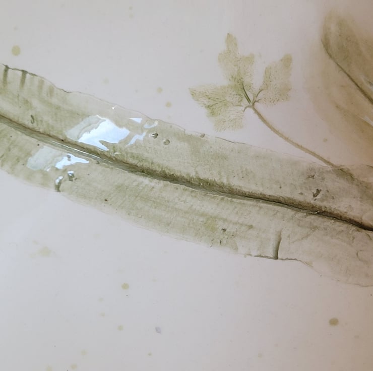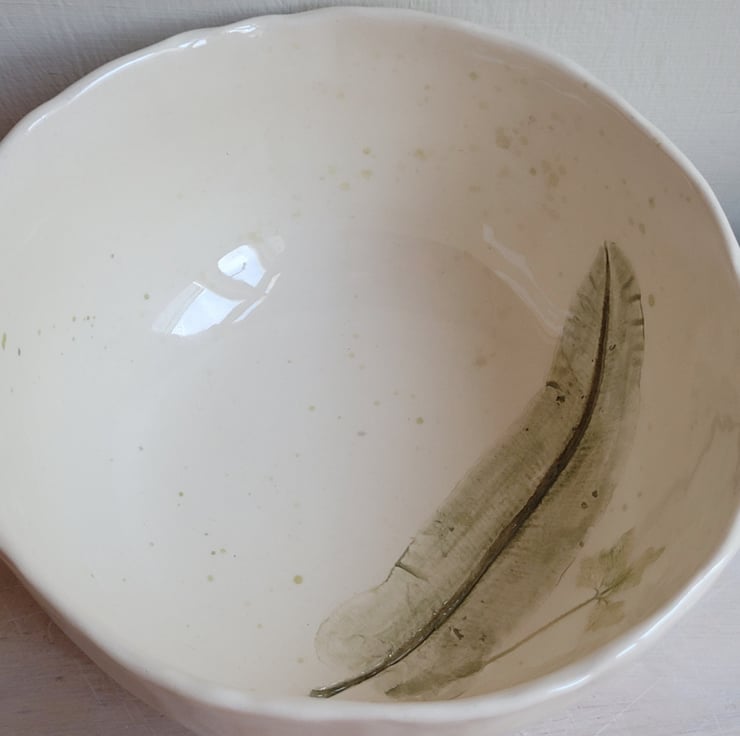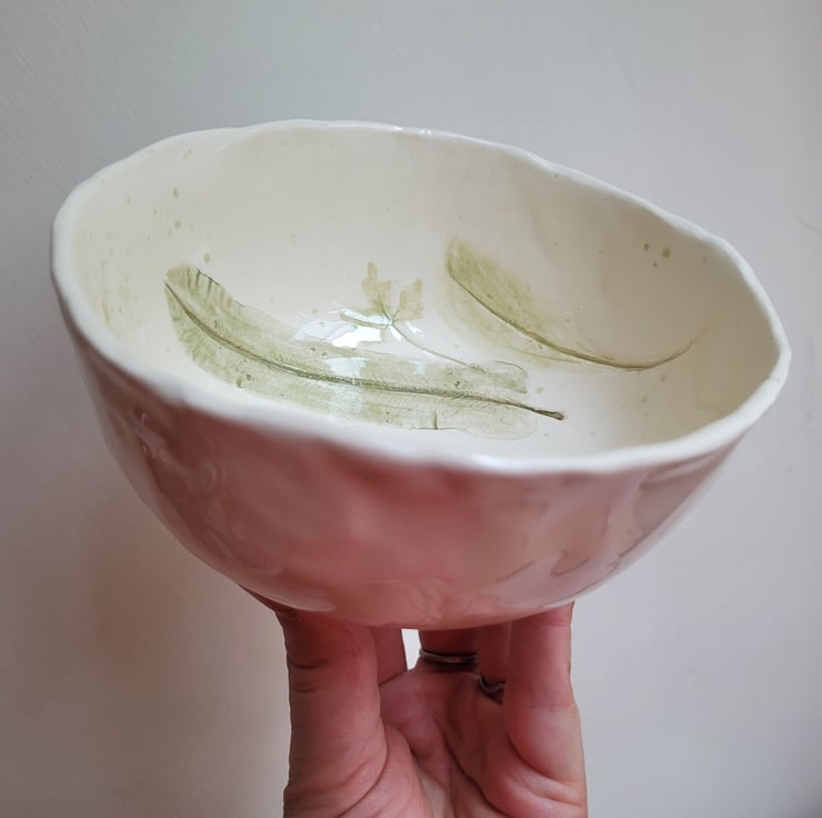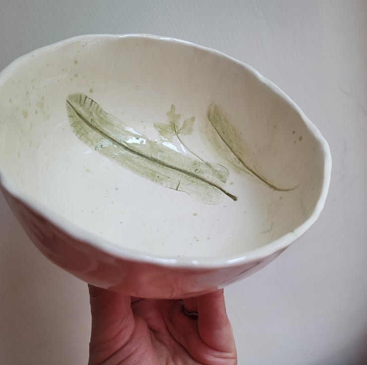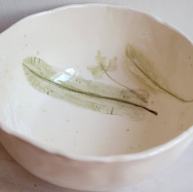 Ceramic bowl with green leaf design hand made botanical splatter pattern.