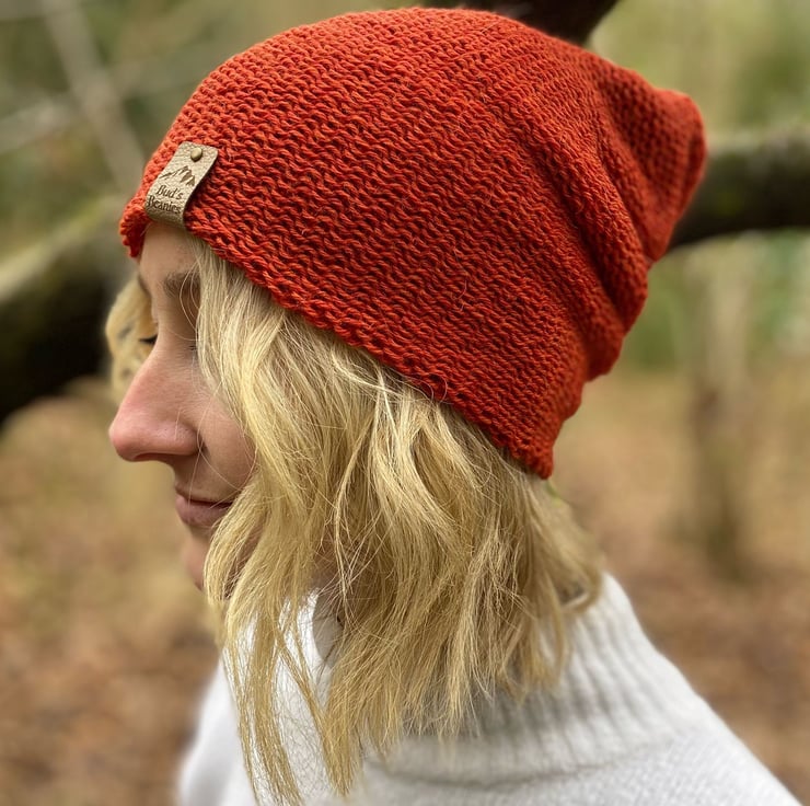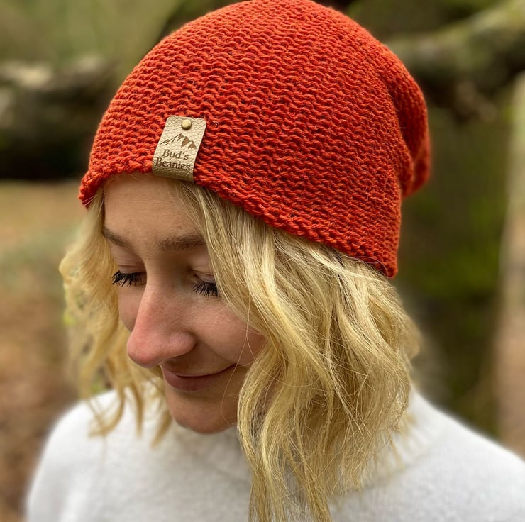 Slouchy style beanie hat in colour 'Moroccan Spice' (rust orange/red). Knitted in a double layer for optimal cosiness with 100% wool and a faux-leather tag.