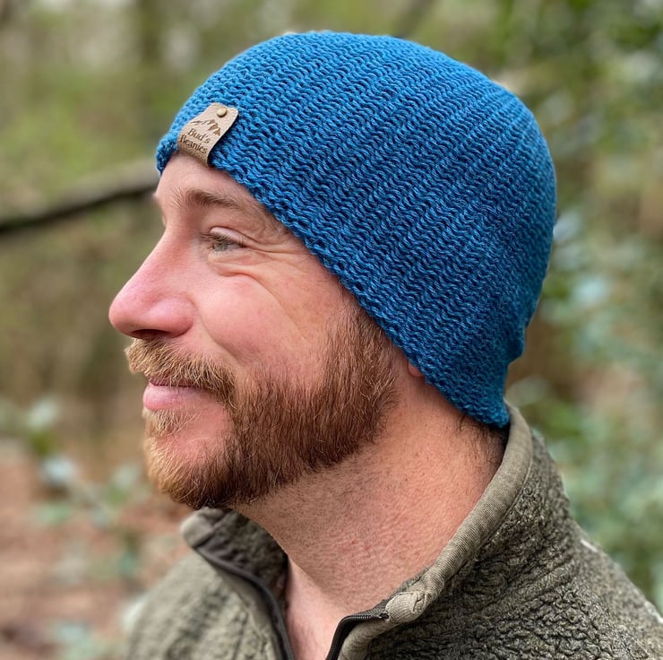 Skullcap style beanie hat in colour 'Waterfall' (Cobalt blue). Knitted in a double layer for optimal cosiness with 100% wool and a faux-leather tag.