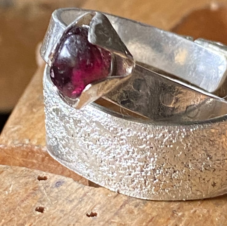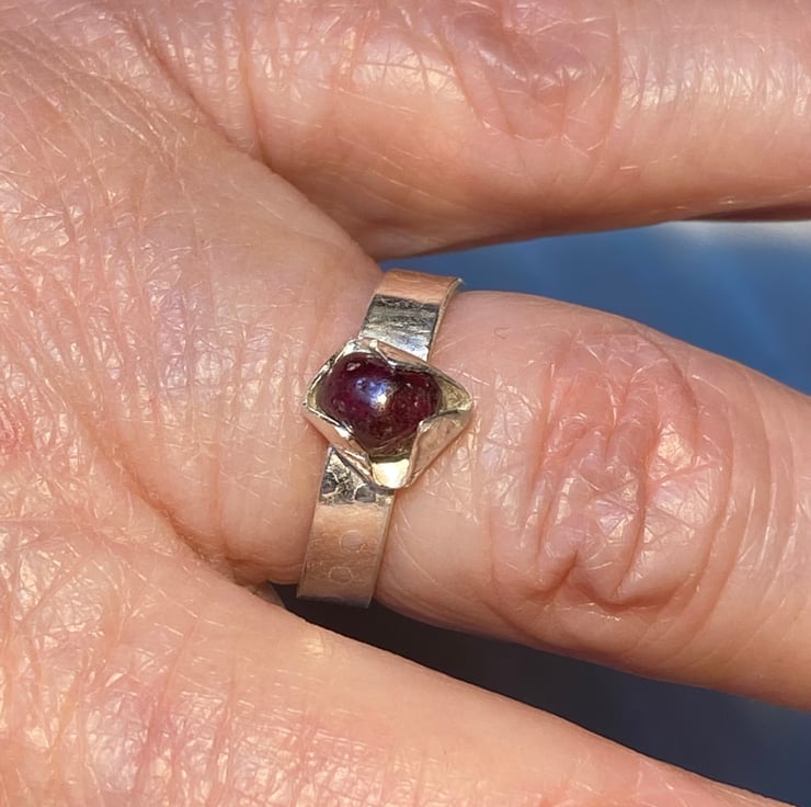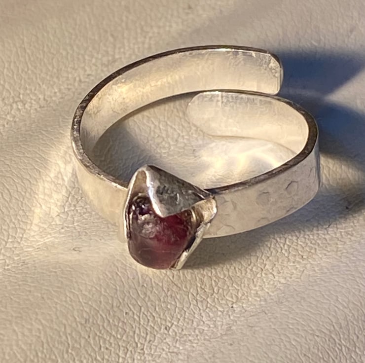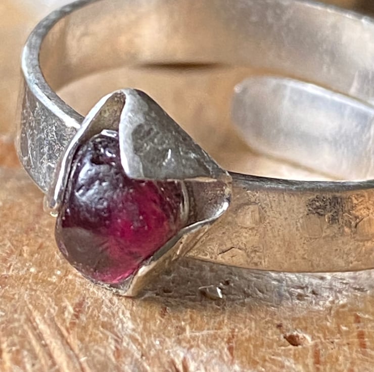 This Thames garnet has been partially polished to show the beautiful colour then wrapped in fine silver and set onto a sterling silver open band. It is adjustable between UK sizes M to S. please specify size when ordering if you know it. Tension setting. Knocks should be avoided where possible.