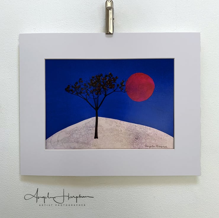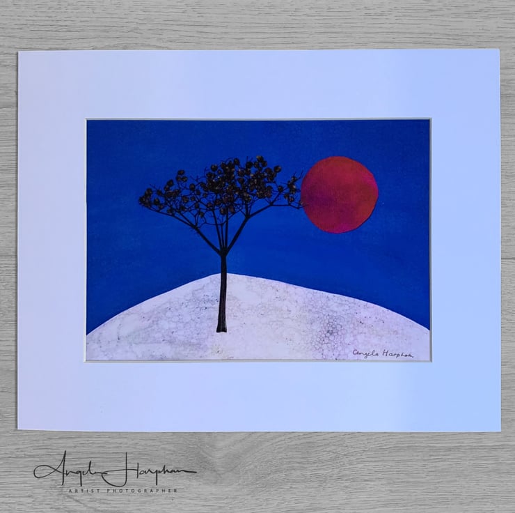 Digital art print from a photograph of an original watercolour painting with elderberry sprig and silk fibre pink magenta moon or sun, on good quality paper using archival inks.
