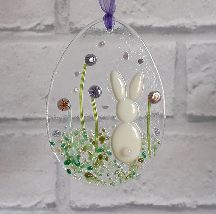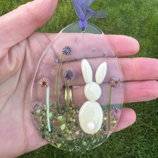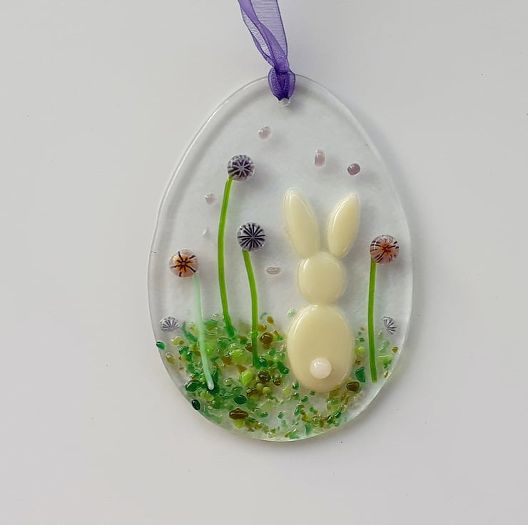 Fused glass Easter egg hanging decoration, depicting a little white rabbit amidst some flowers. This would make a lovely little gift for Easter (and will last longer than chocolate !)