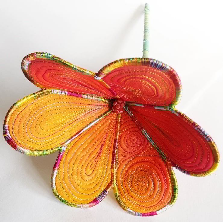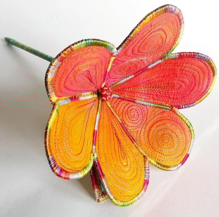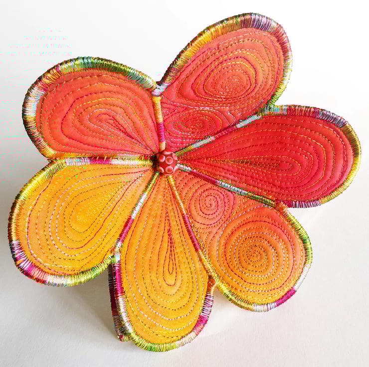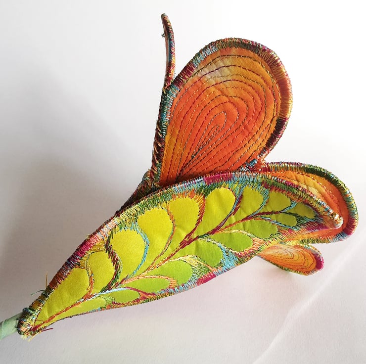 Made from layers of fabric including hand dyed Egyptian cotton and silk fabrics using the free machine embroidery style of sewing