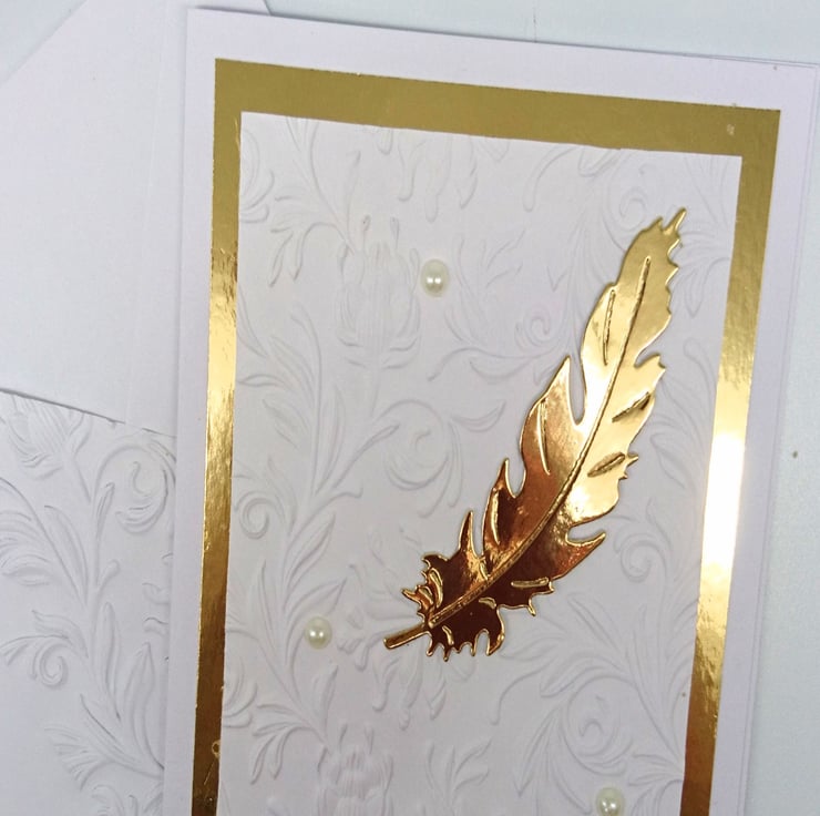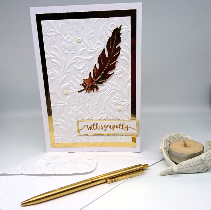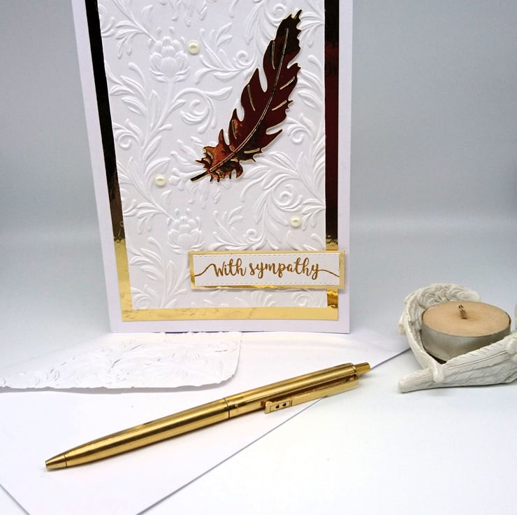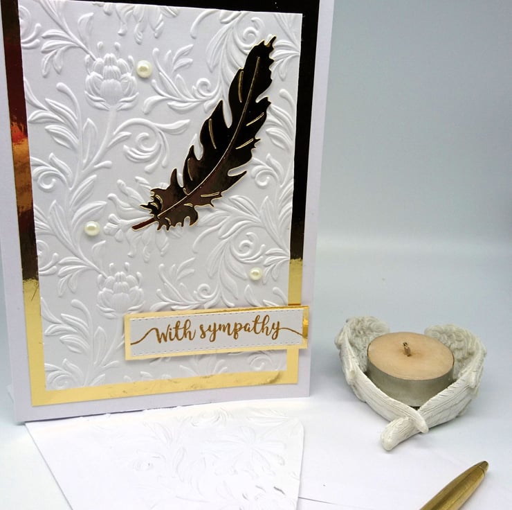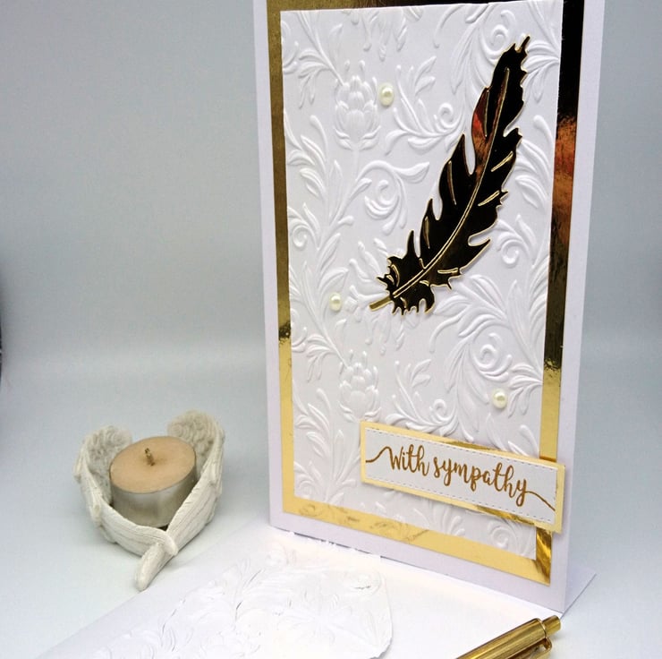 The 5" x 7" card is layered, firstly with a panel of shimmering gold, overlaid with a beautiful 3D embossed panel of white flowers, adorned with a golden angel feather and pearls for tears. The composition is completed with a co-ordinating "With Sympathy" sentiment in gold and white. I have also embossed the white envelope flap to match.