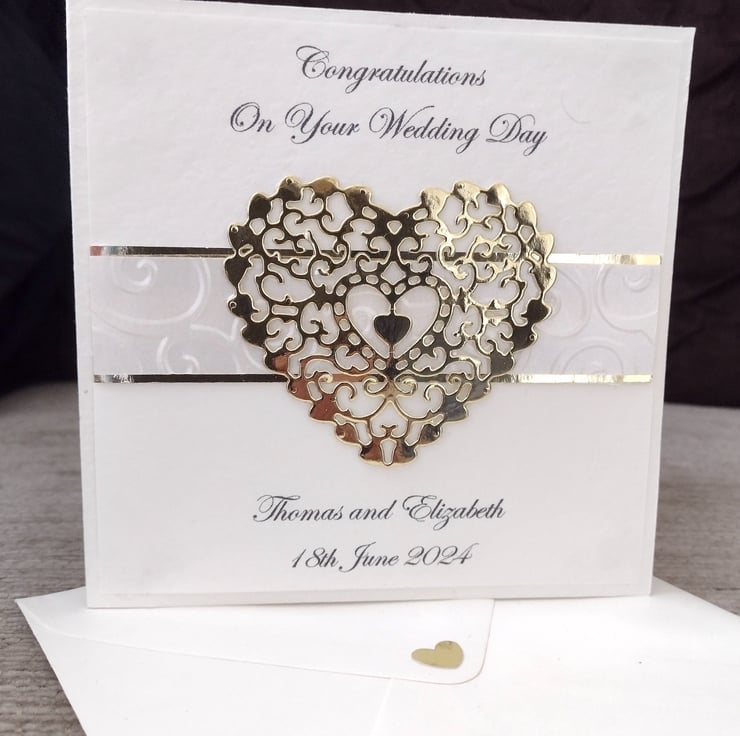 Decorative personalised gold heart wedding card, created from folded ivory hammer card with an embossed pearlescent ivory flourish and gold metallic banner, layered onto ivory hammer texture paper, printed with the text "On your Wedding Day" above a large intricate die cut metallic gold heart and your own personalisation requirements printed underneath.