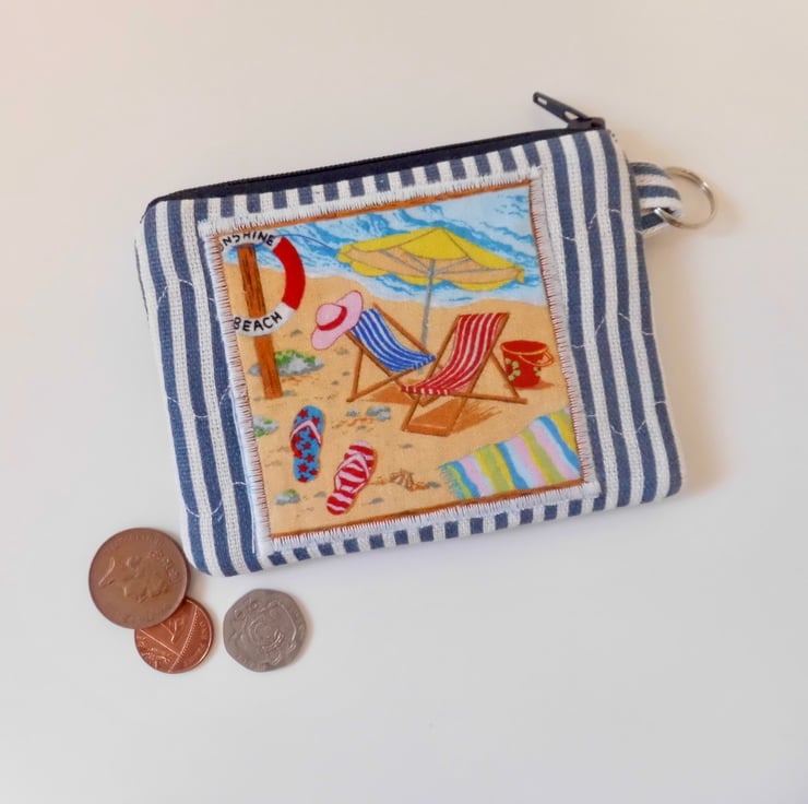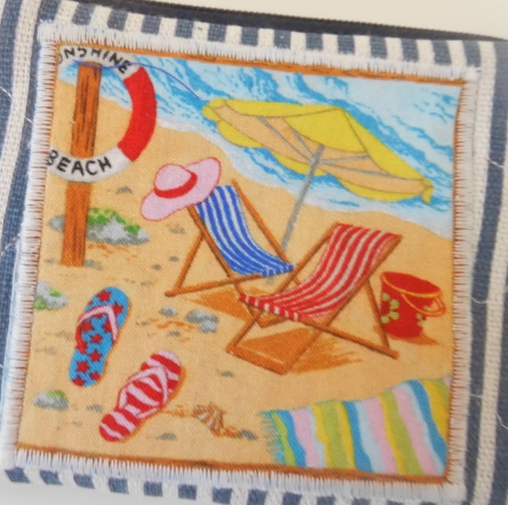 I made this purse using a canvas style fabric in blue and white stripes. I backed it with felt and stitched across back and front with three rows of wave stitch to give it some extra body. On the front is an appliquéd printed panel which features a beach scene with deck chairs and flip-flops. Lined with blue and white poly/cotton check.