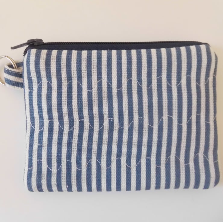 Flat style with a navy zip across the top. I've inserted a key ring into one side to make it easy to clips to your key ring or inside your bag.