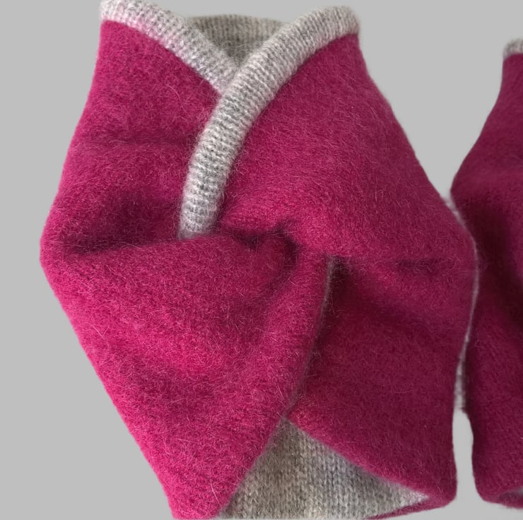 Luxurious wrist warmers in raspberry pink felted cashmere trimmed and lined with grey, re-imagined from up-cycled cashmere sweaters. Cashmere is the fine hair from the underbelly of goats, highly prized for its softness and warmth.
