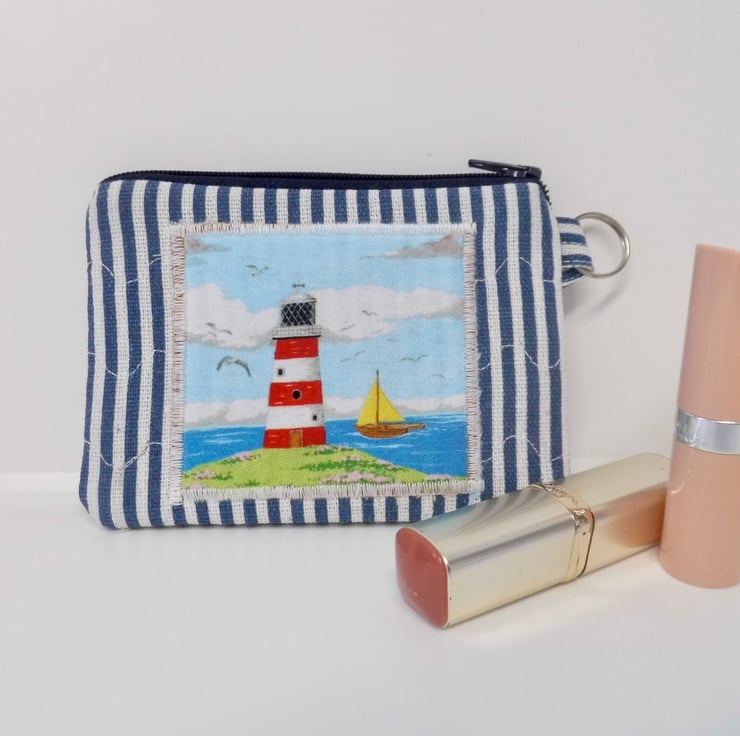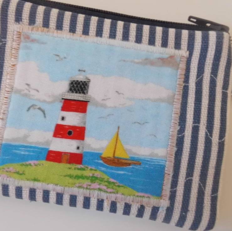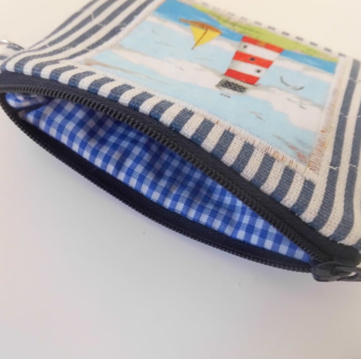I made this purse using a canvas style fabric in blue and white stripes. I backed it with felt and stitched across back and front with three rows of wave stitch to give it some extra body. On the front is an appliquéd printed panel which features a red and white lighthouse and a boat with yellow sails. Lined with blue and white poly/cotton check.