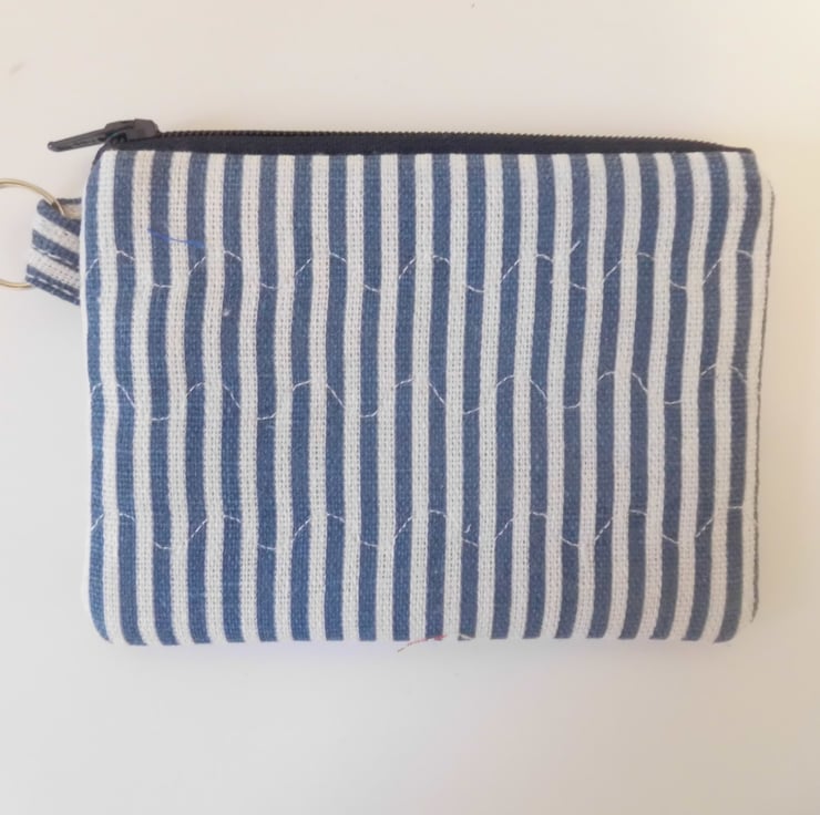 Flat style with a navy zip across the top. I've inserted a key ring into one side to make it easy to clips to your key ring or inside your bag.