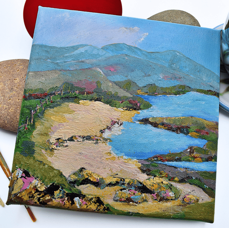 This is a ready to hang painting. The original impasto painting captures a peaceful Scottish coastal landscape. The beach is surrounded by grasslands and rolling hills. The painting is done on a cradled canvas, which gives it a sturdy and durable support. It is ready to hang on your wall to bring a piece of Scotland into your home.
