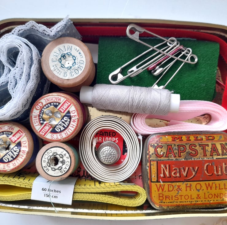 Vintage sewing haberdashery kit in an old metal sweet tin