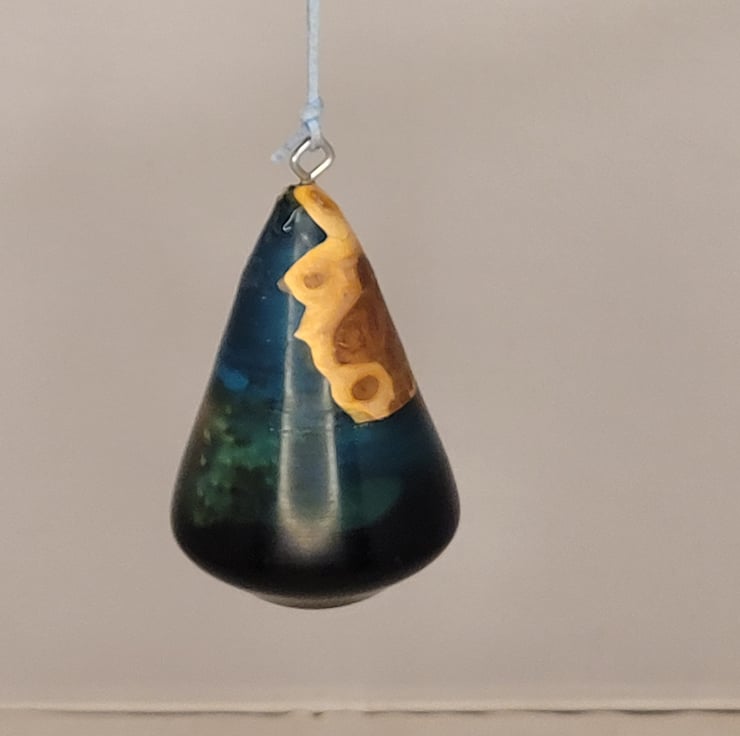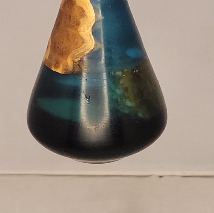 This is a sapphire blue resin droplet mixed with yew , i cast these using resin mixed with wood in this case yew, i then take it and turn it on my lathe into a hanging ornament. these look amazing in a window when the sun hits it and it reflects a blue light all around .
