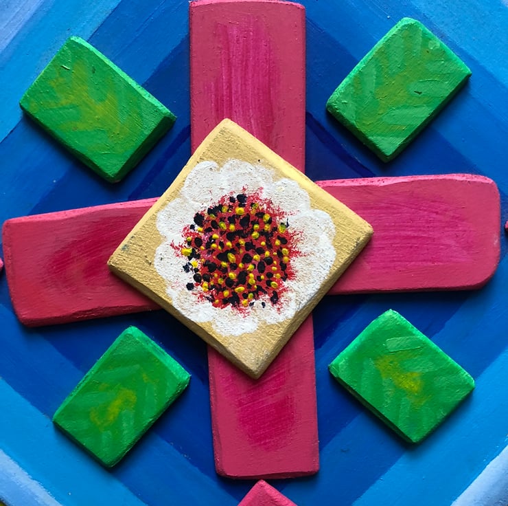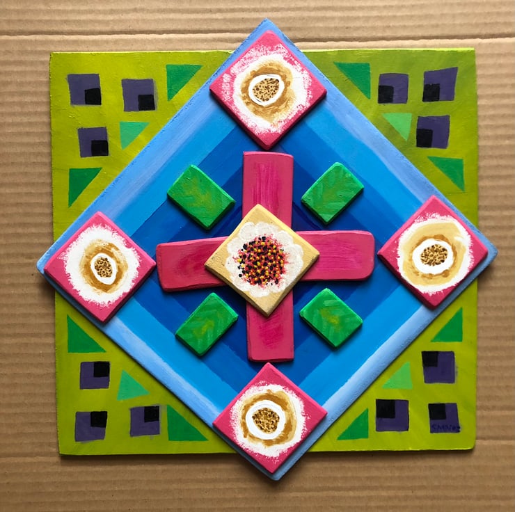 A smaller painted piece, acrylic on board with relief pieces, this is a concentrated study in colour. This original artwork is ready to hang. Size 33x33cm