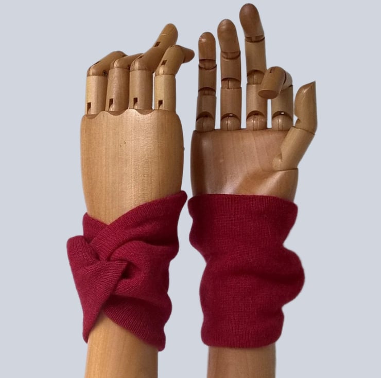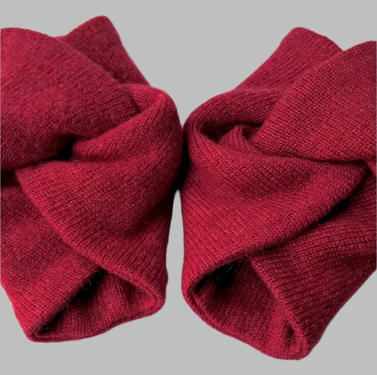 Luxurious wrist warmers in ruby red cashmere, re-imagined from up-cycled cashmere sweaters. Cashmere is the fine hair from the underbelly of goats, highly prized for its softness and warmth.