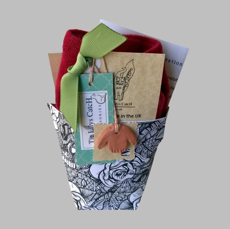 Packaged within a traditional origami festival cup in various colourful patterned and plain paper, to honour and celebrate the sweater that was, along with a cedar heart to help guard against moths.