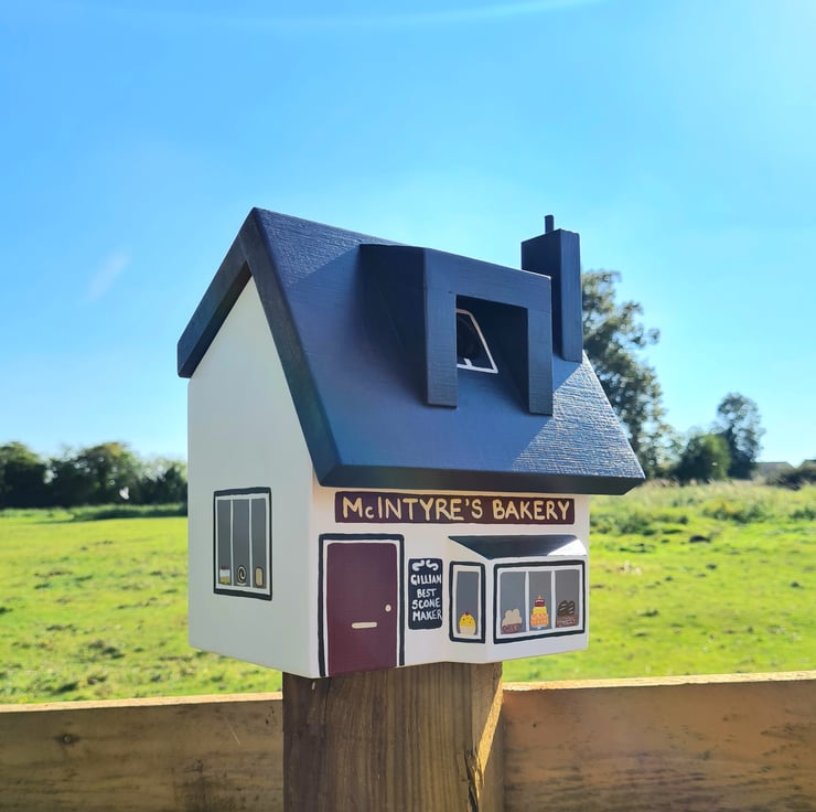 Painted in white with a dark grey roof, the bakery has a little bay window showcasing the cakes and breads! The bakery name can be personalised with up to 20 characters in total and a little black sign on the front can be personalised with up to 4 lines (maximum 8 characters each line).