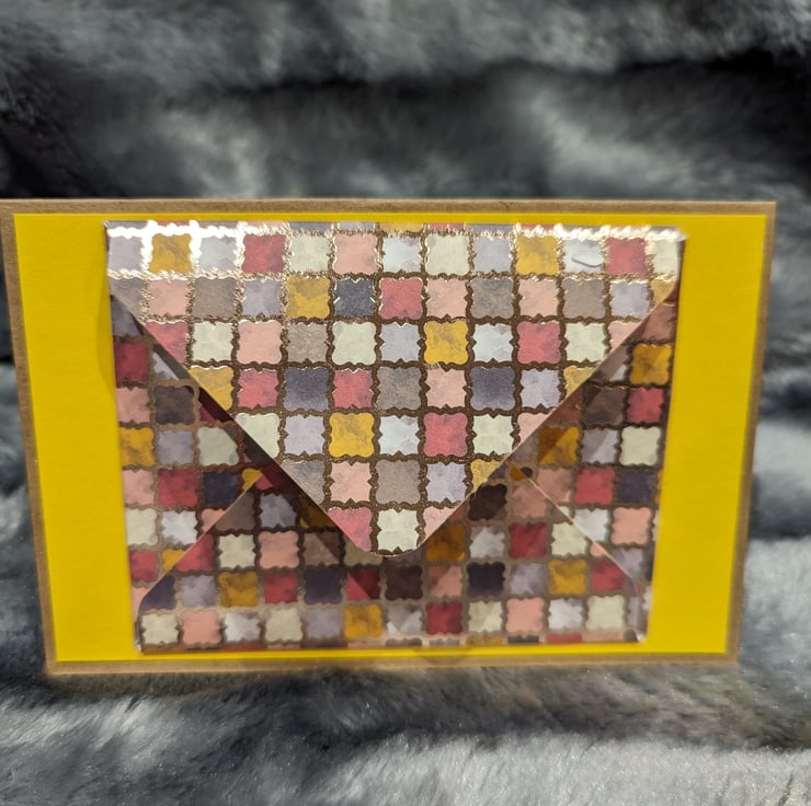 A6 landscape kraft card stock with matching envelope, overlaid with a bright yellow card stock, overlaid with a multi-coloured envelope