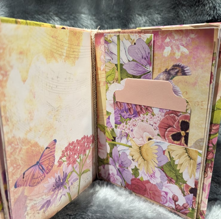 Inside left and right covers, there's a pocket in coordinating card where small notes can be kept