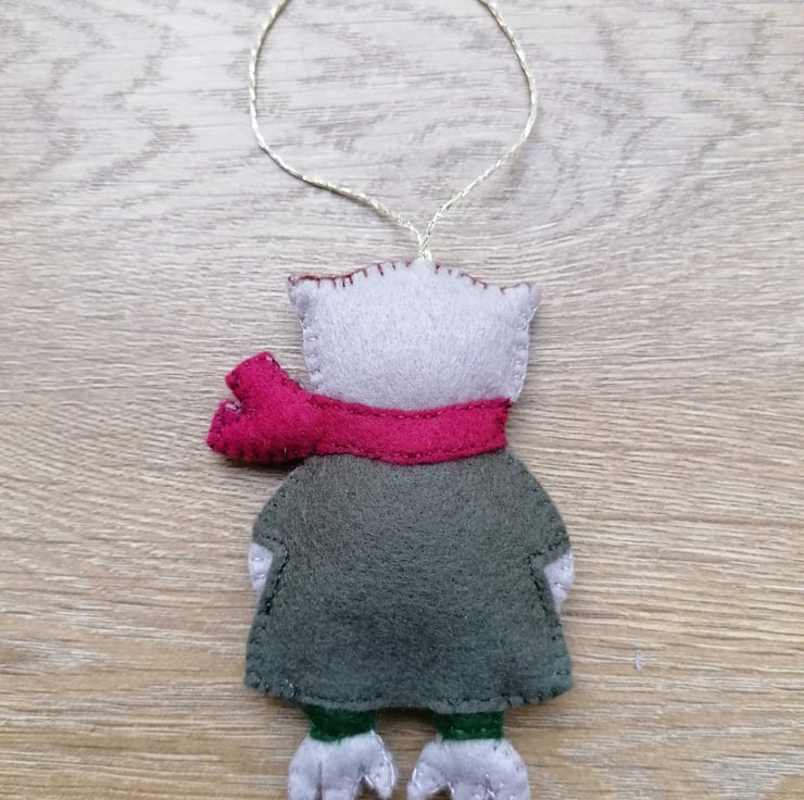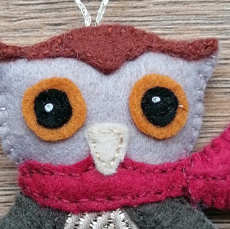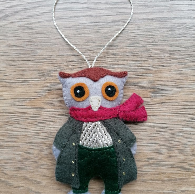 Hand sewn wool felt owl wearing his finest coat, metallic gold shirt and cosy scarf.. With hanging loop. Padded with polyester fibres. Height approx 9cm, width approx 6cm (not including hanging loop). First Class Royal Mail postage.