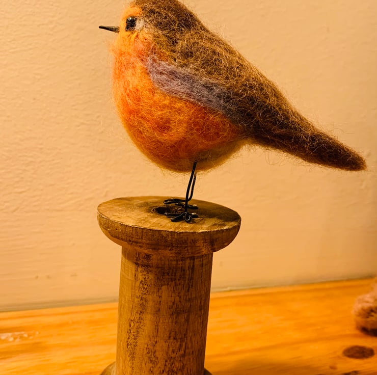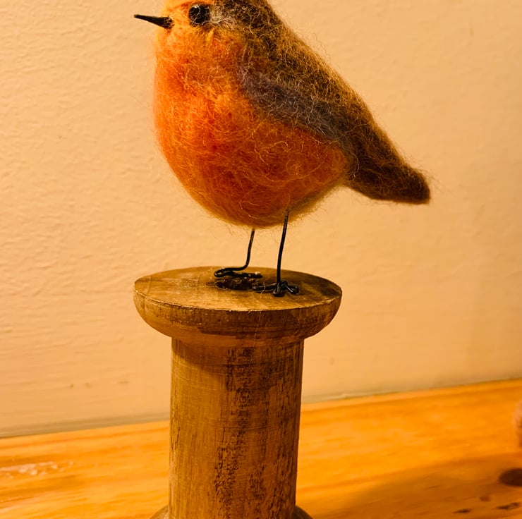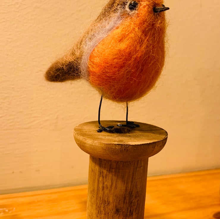 A pretty little needle felted Robin sitting on a wooden bobbin. Needle felted with love.