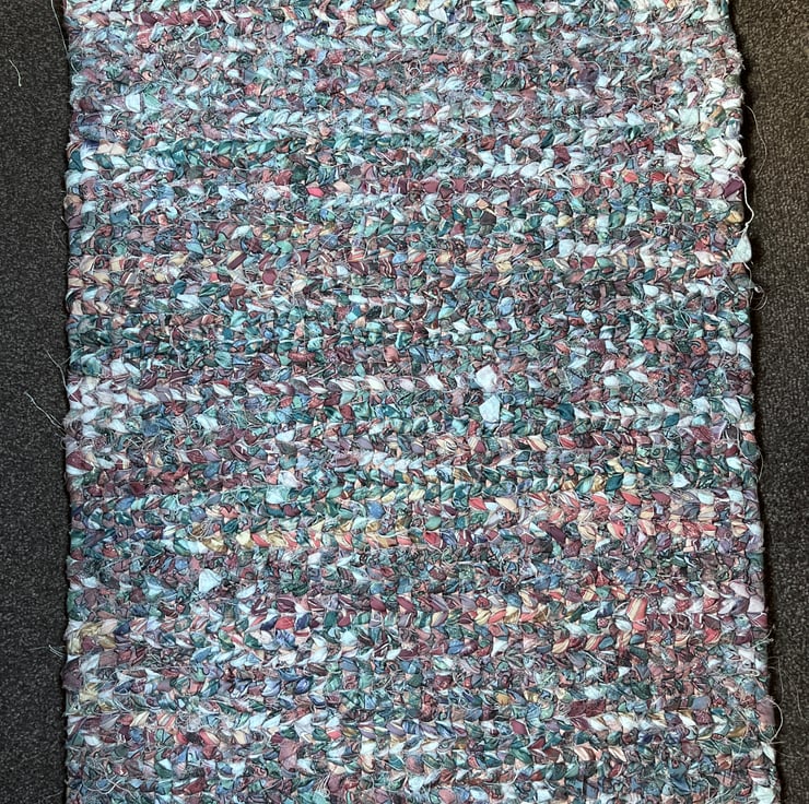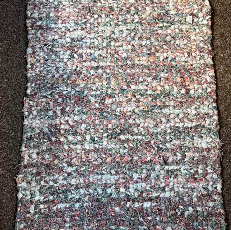 Rustic dusty coral rag rug ideal for bedroom, bathroom or lounge. Handwoven on my small frame-loom using a braided technique to create a pleasingly random pattern of coordinated pinks greens and greys.