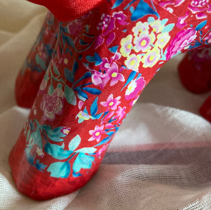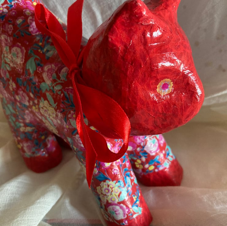 This papier mache cat has been deCopatched using a red paper on head and paws with a floral paper on the main body and legs. It has all been varnished.