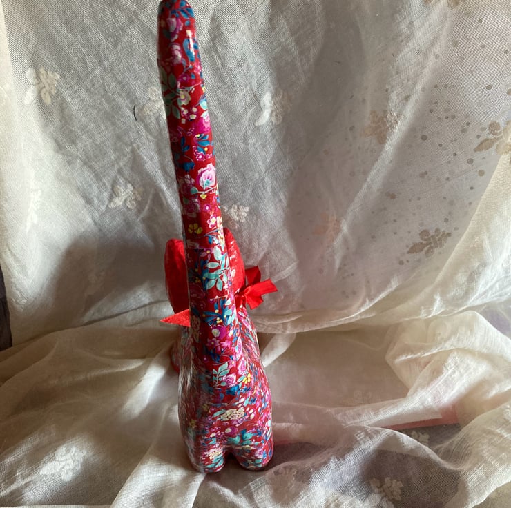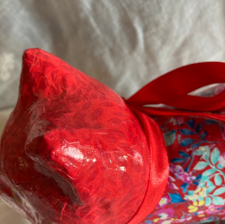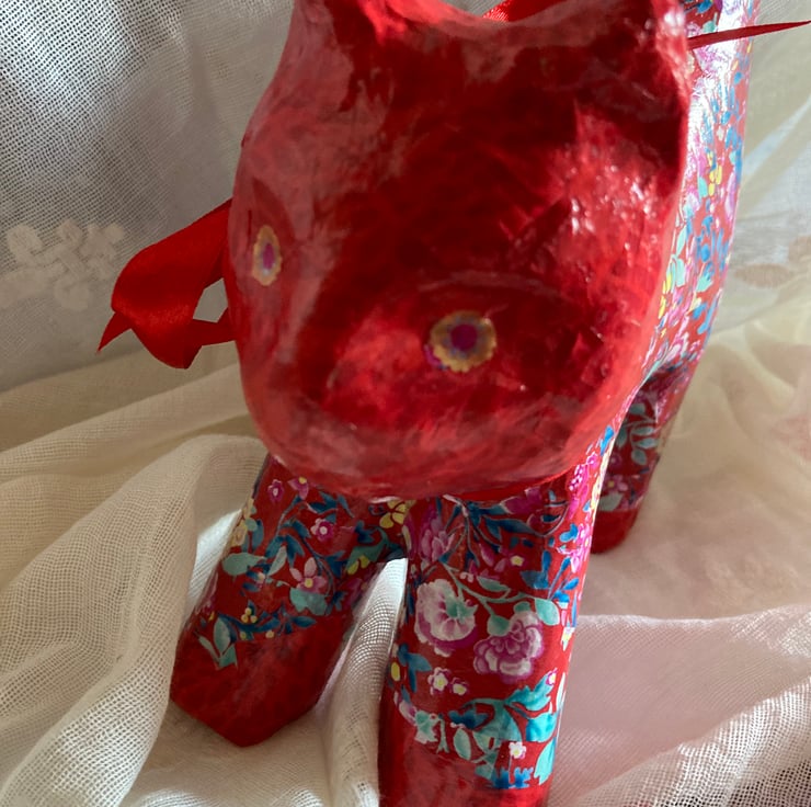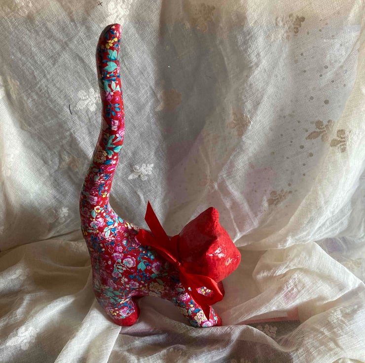 This papier mache cat has been deCopatched using a red paper on head and paws with a floral paper on the main body and legs. It has all been varnished.
