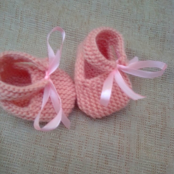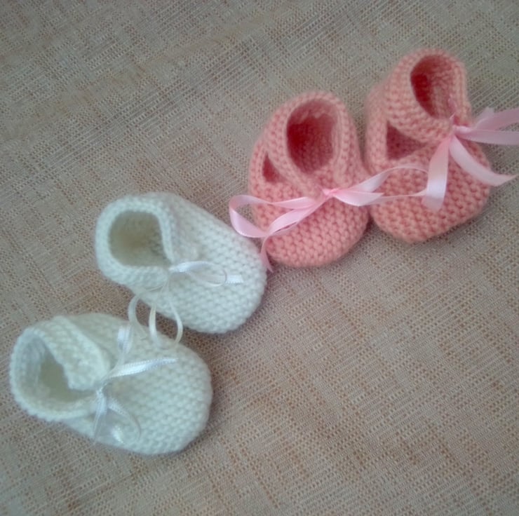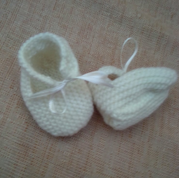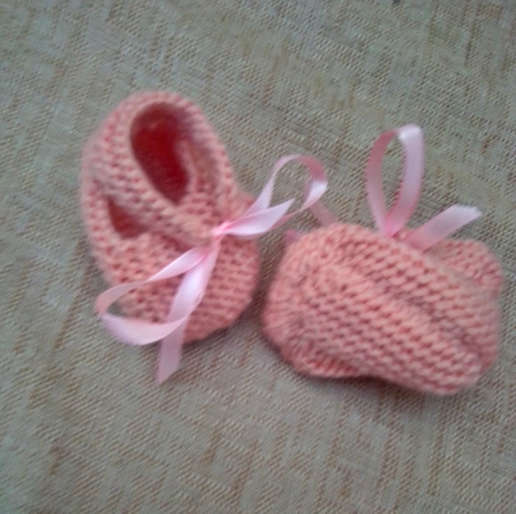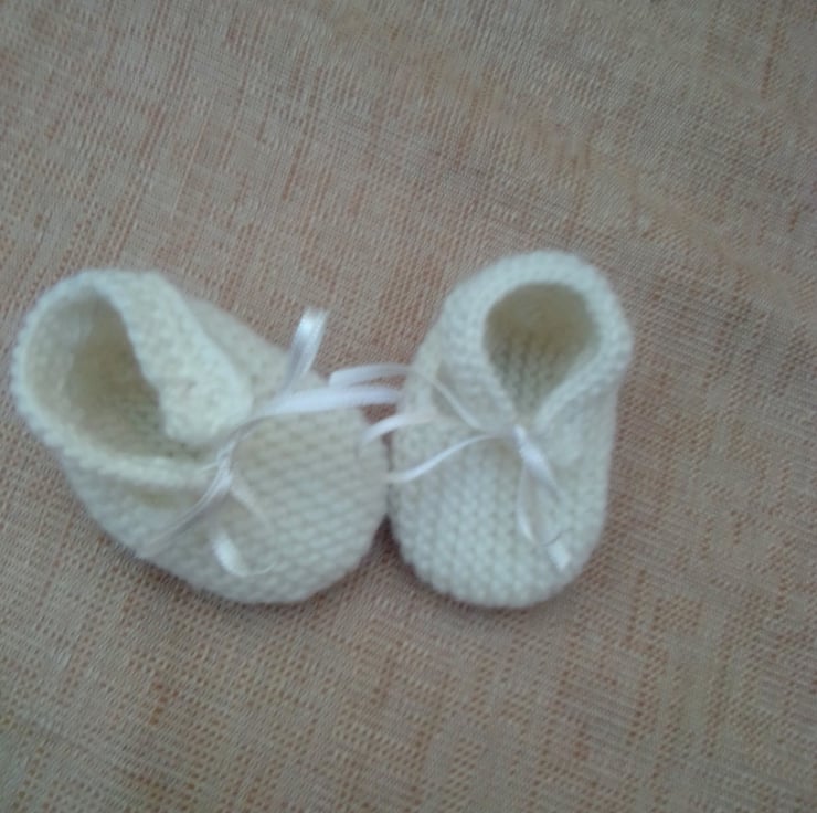 A pair of knitted shoes for a baby. They are made to fit a 0 - 3 month old baby and they are hand knitted in double knitting yarn. They would make an ideal gift for a baby shower, new baby or just as something to for your little ones to wear.