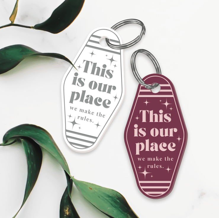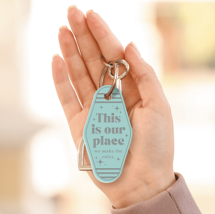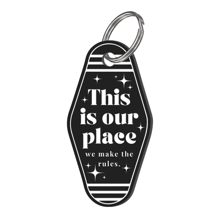 Create memories and cherish your special place with our engraved motel-style keyring inspired by iconic lyrics, the keyring proudly declares, "This is our place, we make the rules." Perfect for couples who want to carry a piece of their unique love story wherever they go.