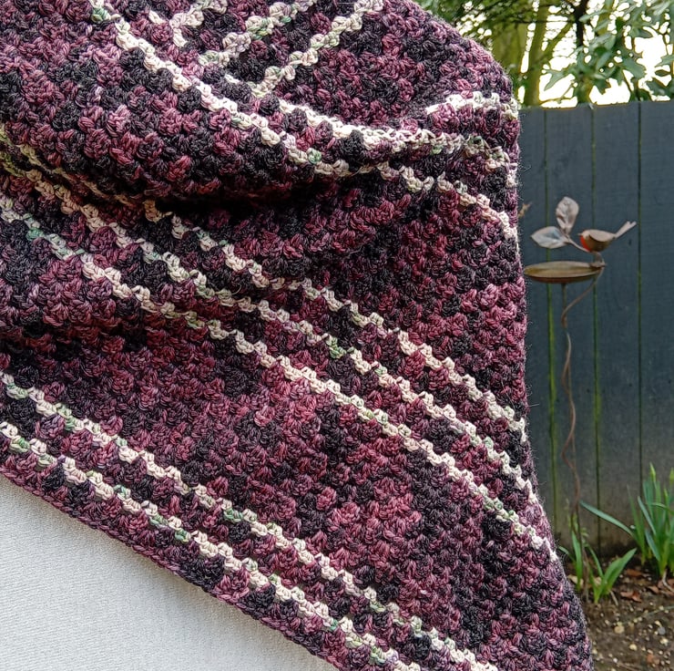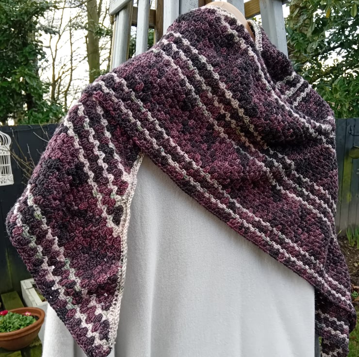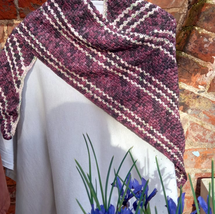 I used a 4ply yarn, but this shawl does grow quickly and is cosy, warm and light to wear. The shawl is a triangular shape and I used a contrasting yarn and stitch to make the shawl more interesting, together with a very easy edging to tidy up and uneven edges!