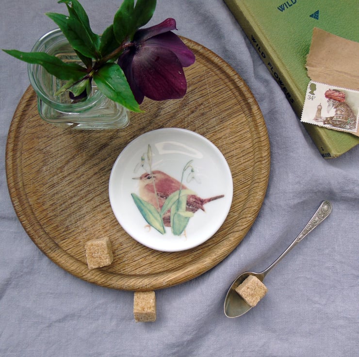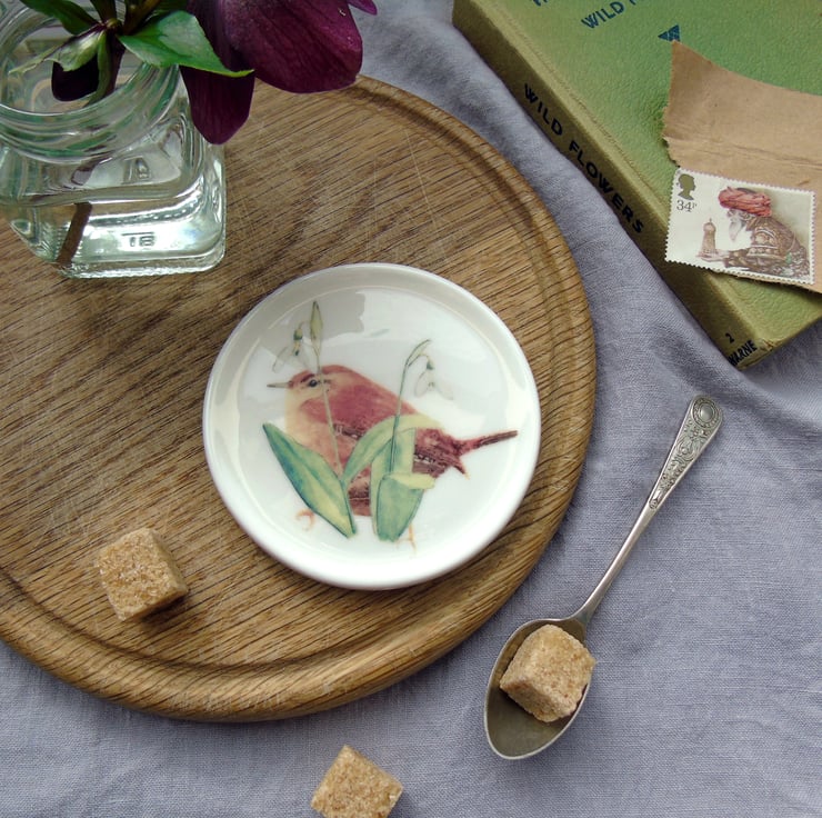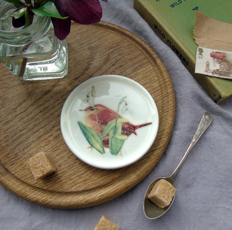 Hand decorated bone china coaster with my cute wren and snowdrops watercolour painting, a lovely small token gift for gardeners and bird lovers. My illustrations are professionally printed onto ceramic transfers which I cut and apply by hand to each coaster. They have a slight rim so are also equally suitable to use as a spoon rest.