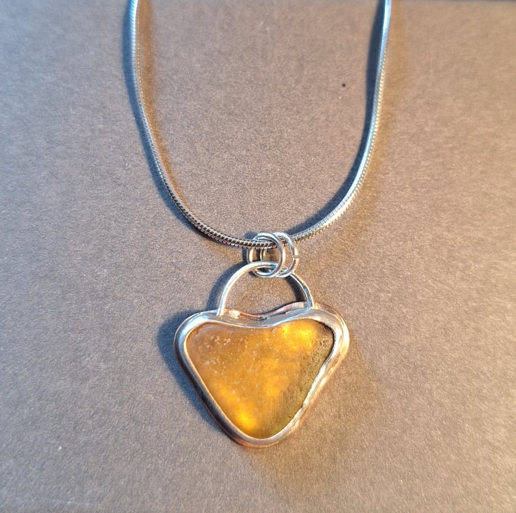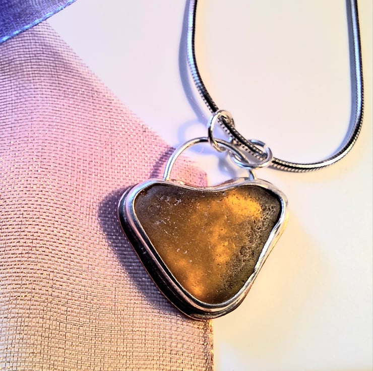This lovely heart shaped piece of seaglass is an unusual honey colour. It has a silver bezel and a copper back. It is hung on a silver plated snake chain and the pendant measures approx 2cm in length