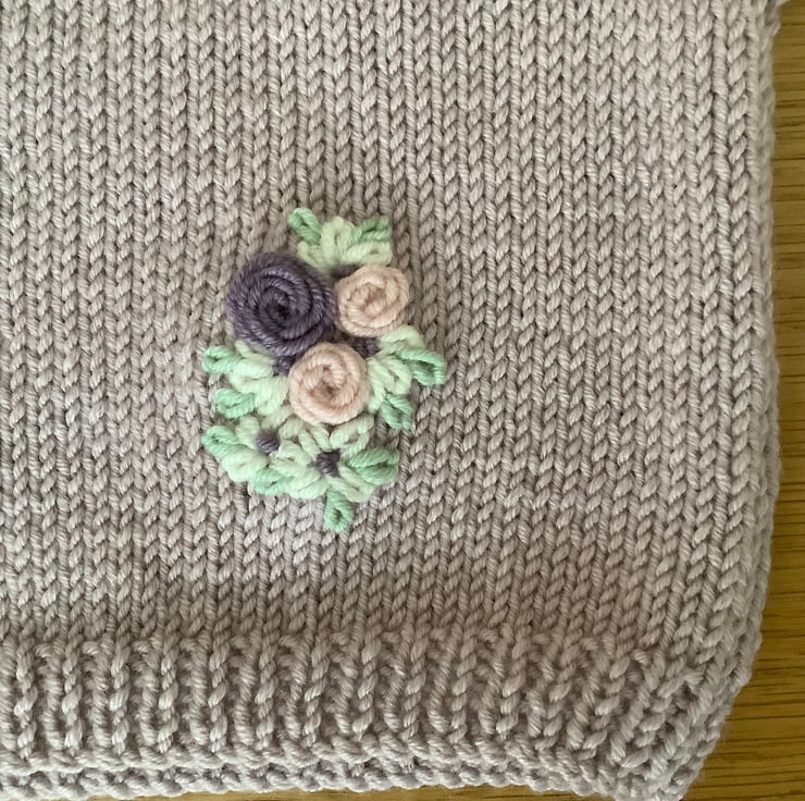 This cute little vest top was hand knitted by me. It contains 12% cashmere so is soft and warm. It is for 0-3 months. It is pale lilac in colour with hand embroidered flowers on the front.