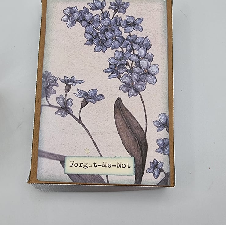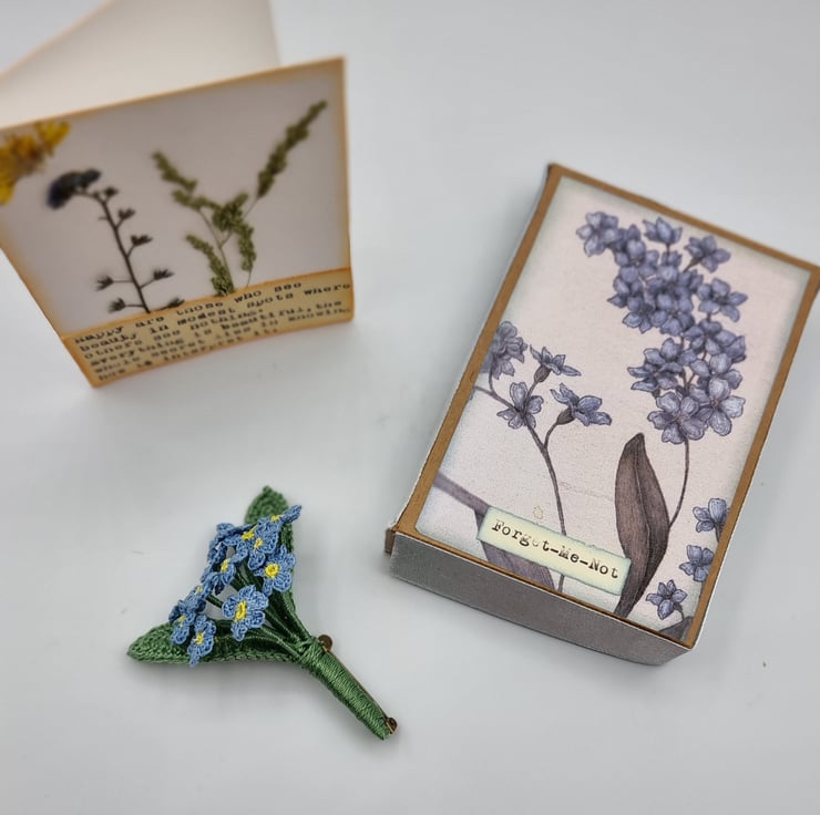 a little crocheted forget me not brooch in its own handmade box