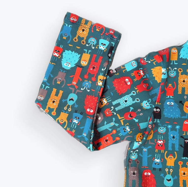 Teal stretchy cotton long sleeved top with multi coloured fun monsters.