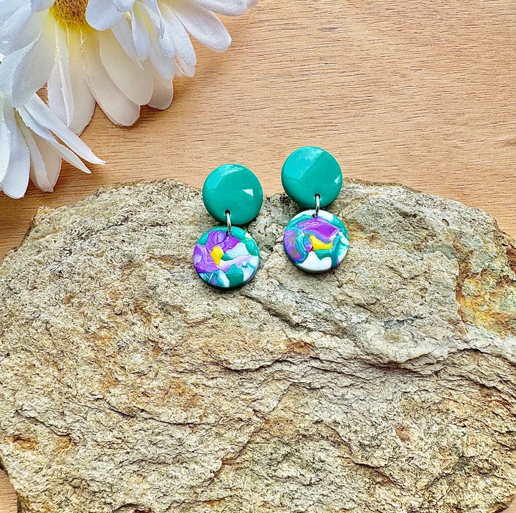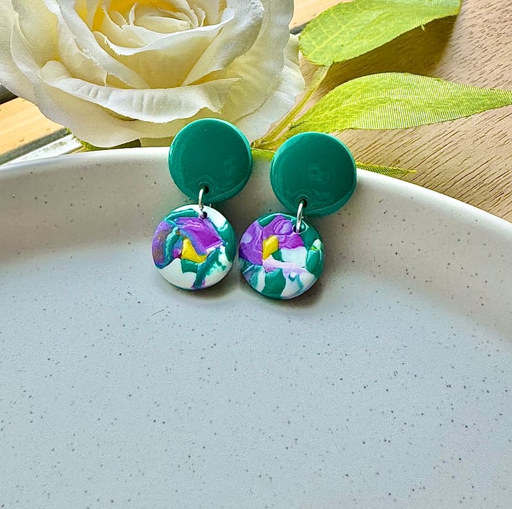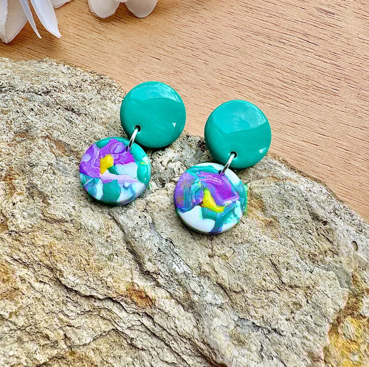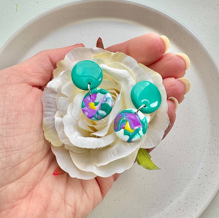 Attached to same size circle of gloriously clashing but Complimentary colours of mixed reworked Turquoise, purples, yellow and white polymer clay