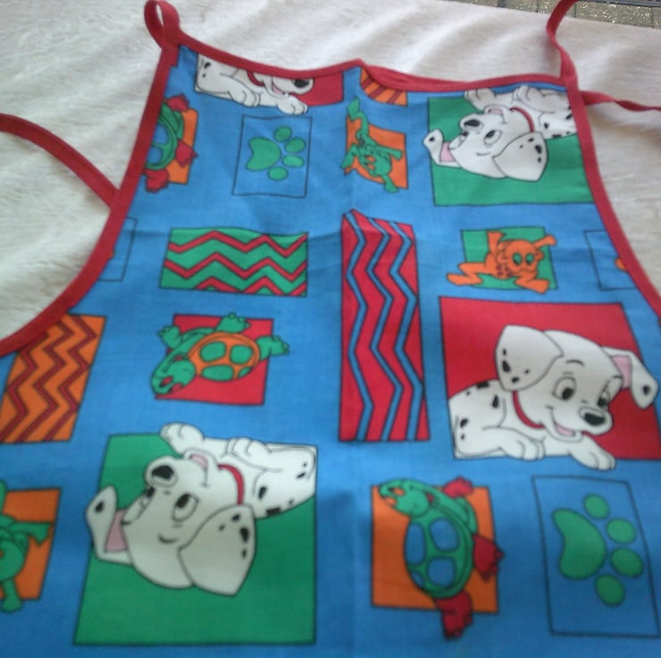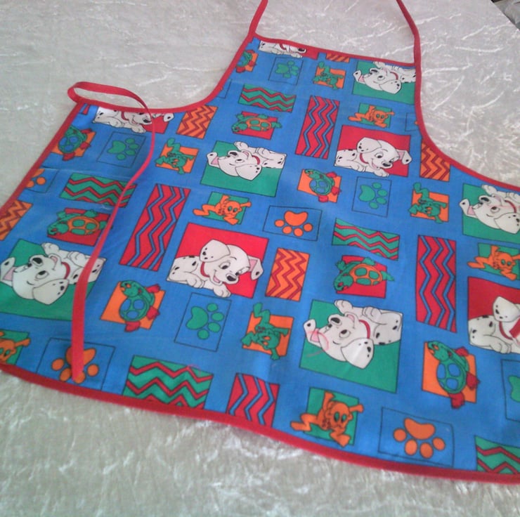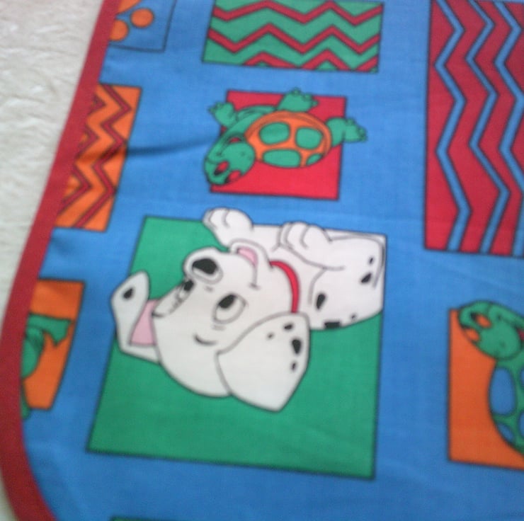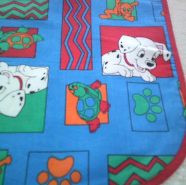 The fabric used has a design of Dalmatian puppies, paws, frogs and tortoises in squares on a blue background. It is edged with a contrasting red bias binding.