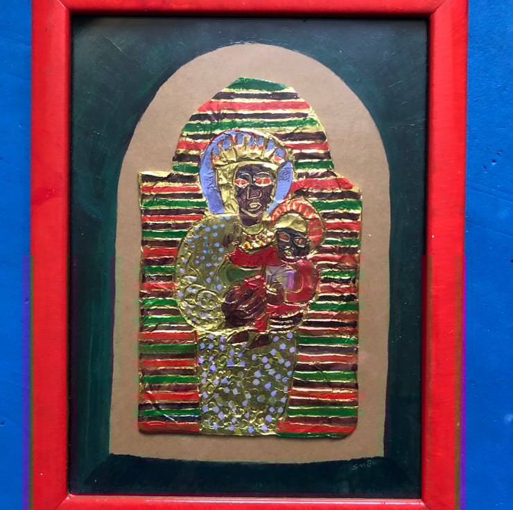 Mother Mary holds the holy child in her arms, surrounded by the glorious colours of creation, a celebration of life only their tears tell of his sufferering to come.