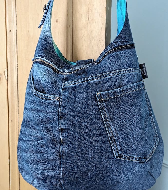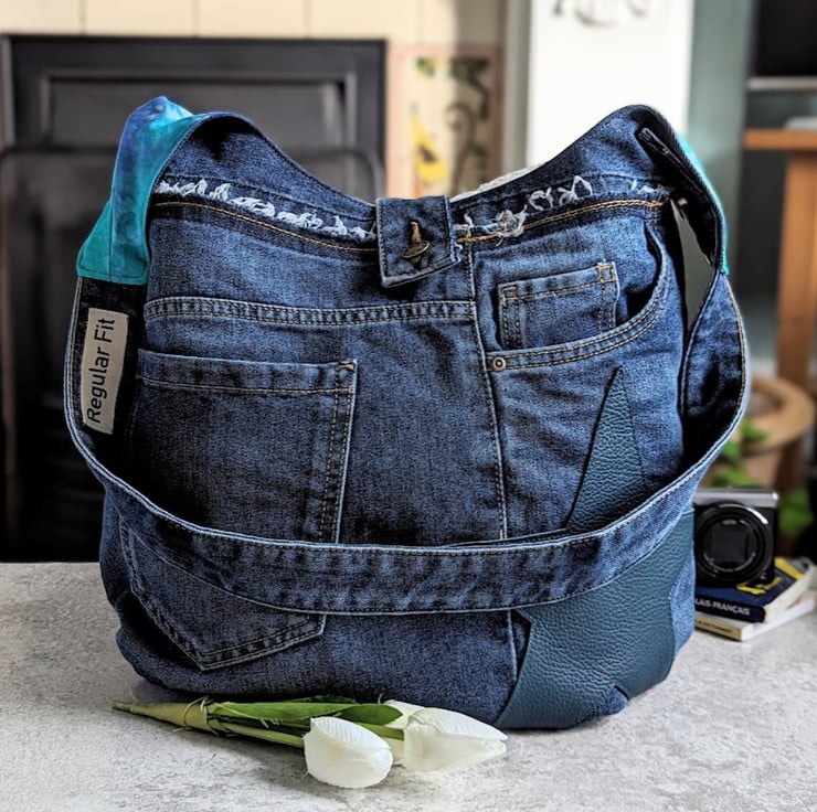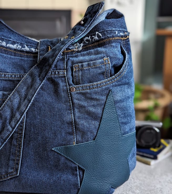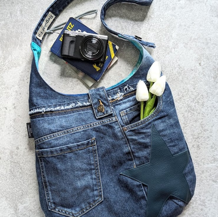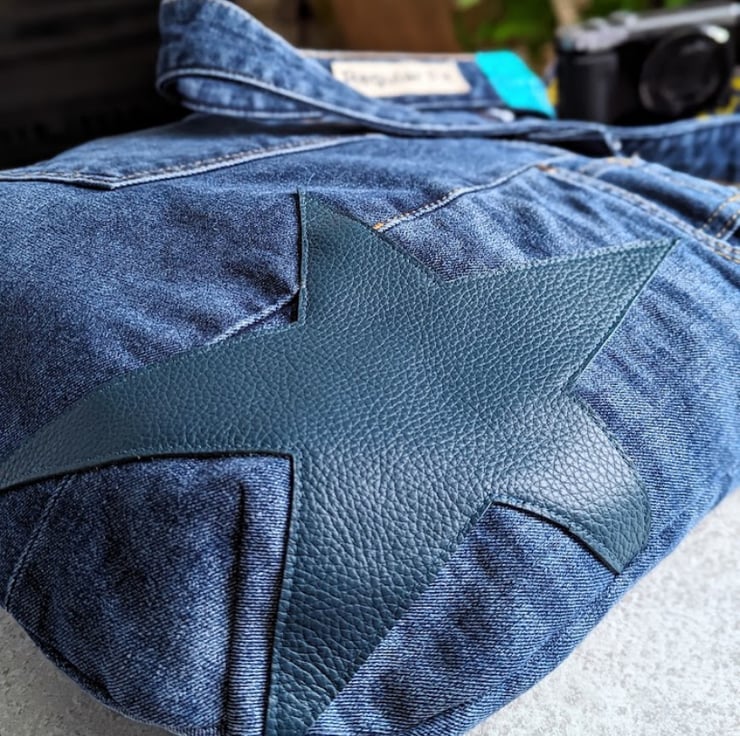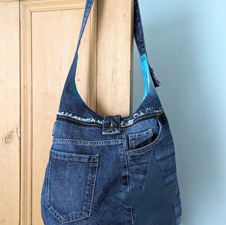 Upcycled denim, a dark teal leather star motif and loads of fabulous detailing makes this shoulder bag a lovely statement piece. It's been designed and handmade by recycling denim jeans and leather off-cuts. It’s large and roomy, slouchy and generous - perfect for all your everyday essentials and more!