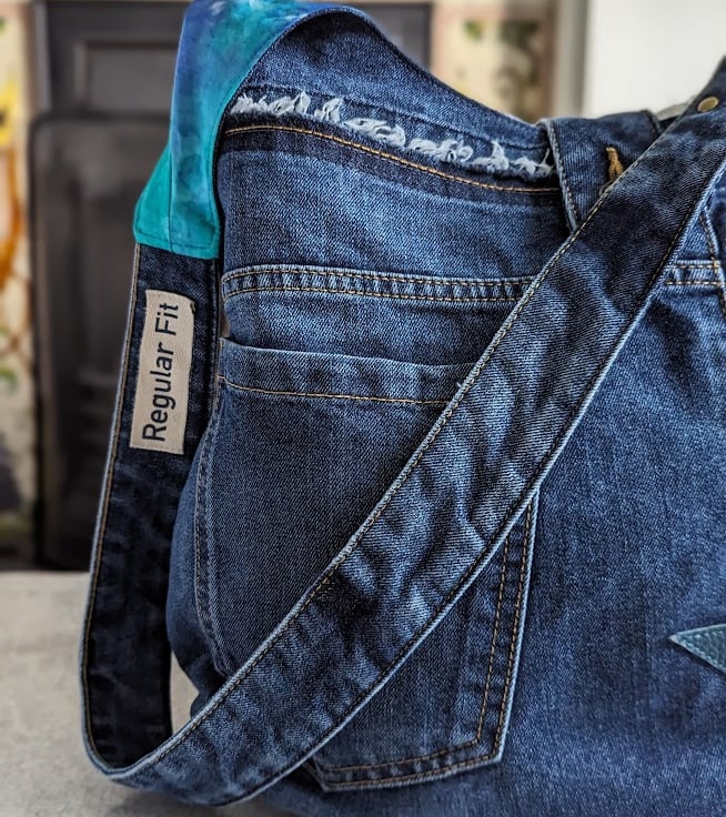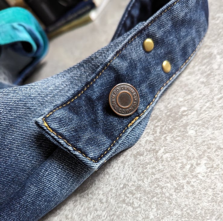 The shoulder strap has been made from the waistband of the jeans and keeps some of the original detailing. It is securely stitched and riveted in place! The strap is approx 4.5cm wide, sits comfortably on the shoulder.