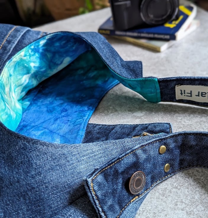 Both front and back of the bag have usable jeans pockets.Inside, it’s lined with a batik print cotton; additionally there's a slip pocket divided for phone, pens etc, and a further slip pocket with a plastic snap closure for added security. For those of us who lose our keys in the bottom of our bag, there's a bronze coloured swivel lobster clasp secured to the inside of the bag with a grosgrain ribbon. A bronze tone button secures the opening of the bag with a flap closure using a piece of the jeans waistband.