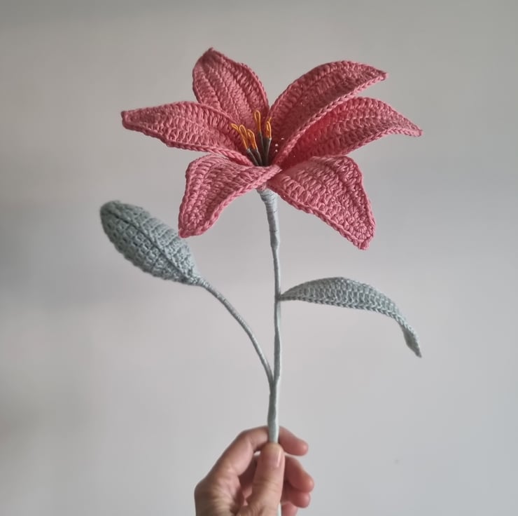 this boquet stands 45 cm tall and is crocheted using organic cotton. there is a sunflower. lily. daisies , cala lilly, a rose and ferns .