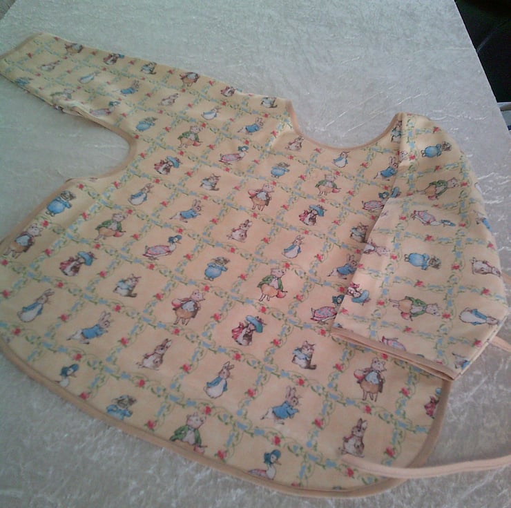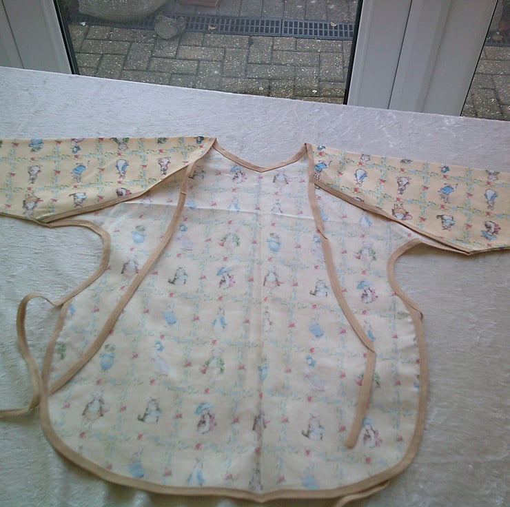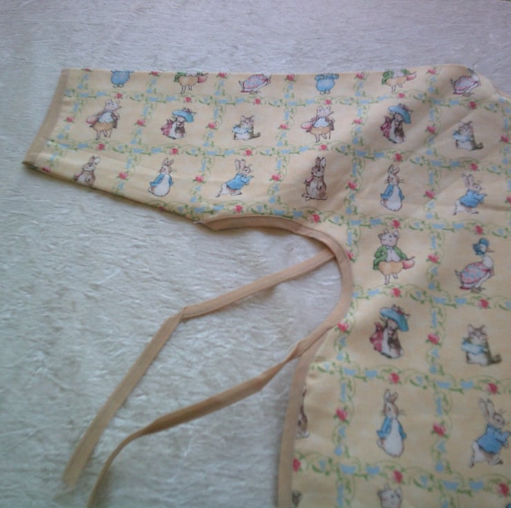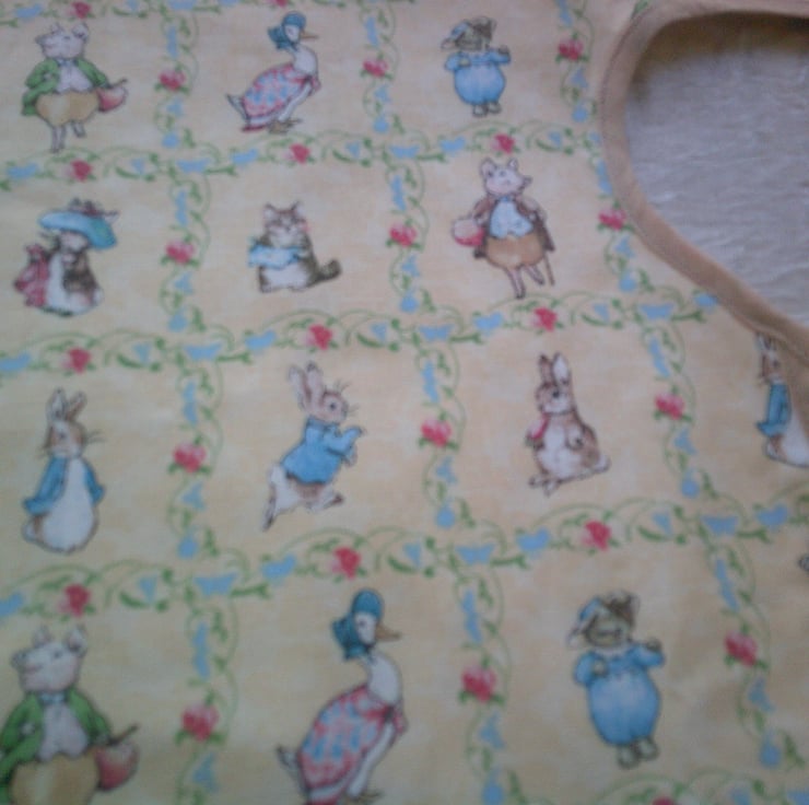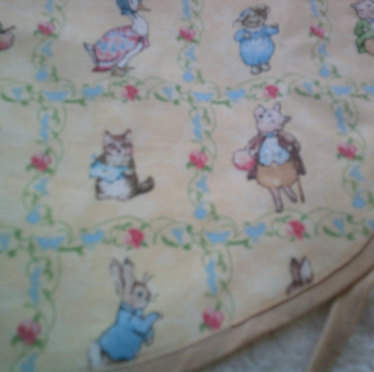 The fabric used is of scenes from various Beatrix Potter Characters including Peter Rabbit, Pigling Bland and Jemima Puddle-duck on a dark cream background and is edged with beige bias binding.
