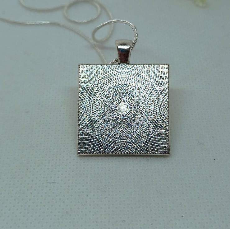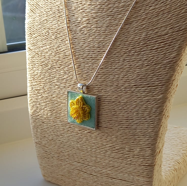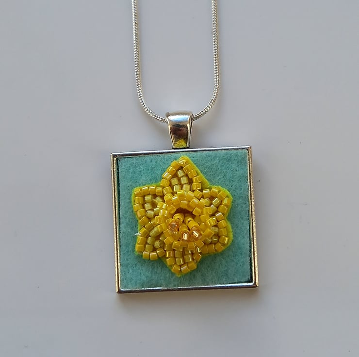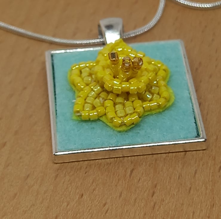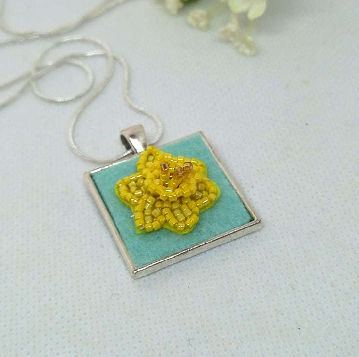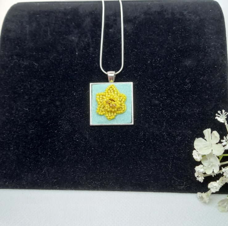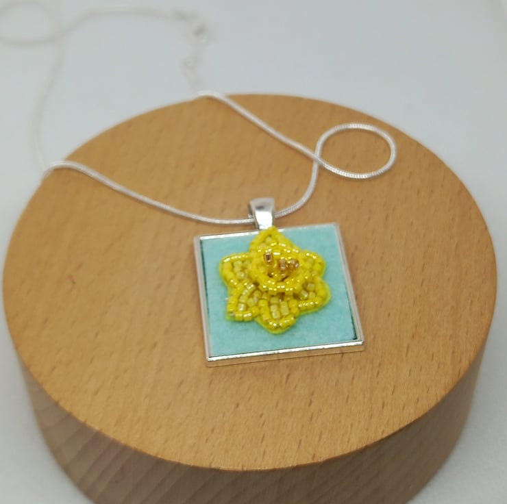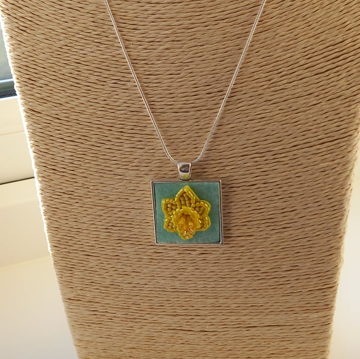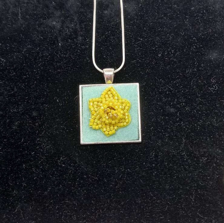 A touch of Spring is always welcome, and this bead embroidered daffodil is very Spring-like! Bright shades of yellow and a touch of gold all embroidered onto a yellow bead backing and then firmly fixed onto pale green felt and set into a square bezel pendant, measuring 2.5cm. The trumpet of the daffodil has been worked in peyote stitch to give a 3D effect. A 20 inch silver plated snake chain completes this very wearable piece.