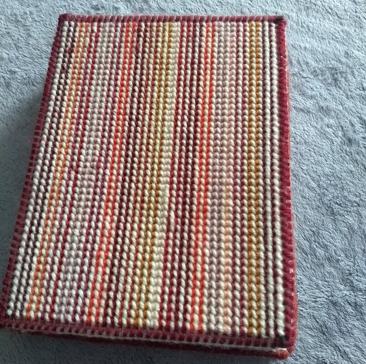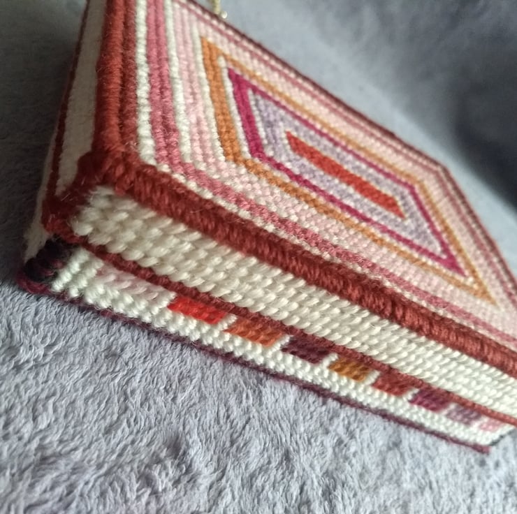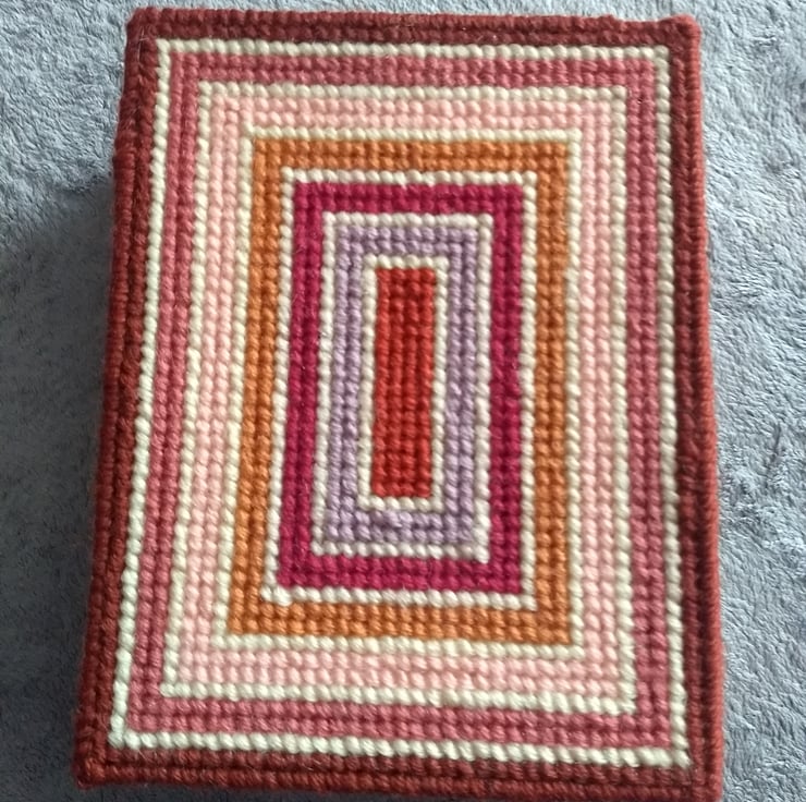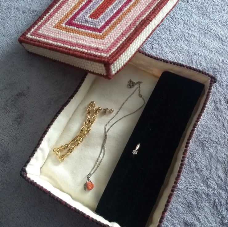 This is a tapestry jewellery box stitched by hand and completely unique. The box is made from plastic canvas and stitched with tapestry wool and is lined with calico fabric. Inside the box is a foam insert for rings the other half is left plain for other jewellery. The box measures 20 x 15 x 4.5cm. Contents not included.